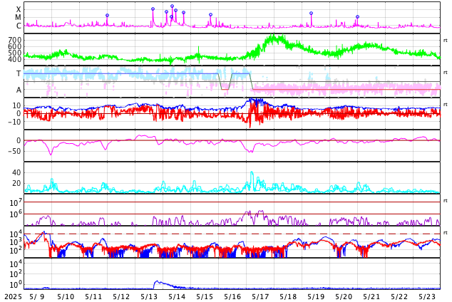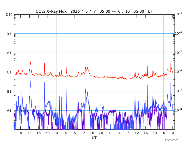 GOES衛星の太陽X線強度。赤・橙 = 0.1〜0.8 nm、青・紫 = 0.05〜0.4 nm (c) データ:NOAA/SWPC、作図:宇宙天気ニュース ![]() | ||||||||||||||||||||||||||||||||||||||||||||||||||||||||||||||||||||||||||||||||||||||||||||||||||||||||||||||||||||||||||||||||||||||||||||||||||||||||||||||||||||||||||||||||||||||||||||||||||||||||||||||||||||||||||||||||||||||