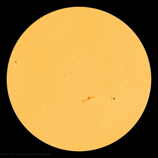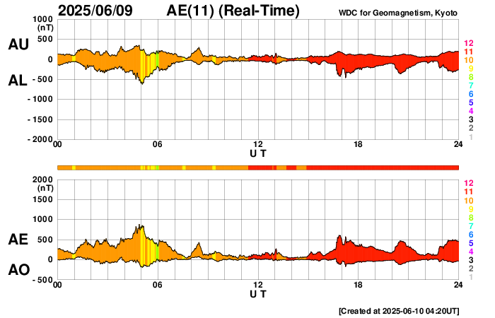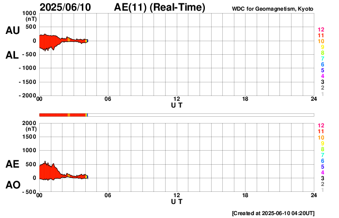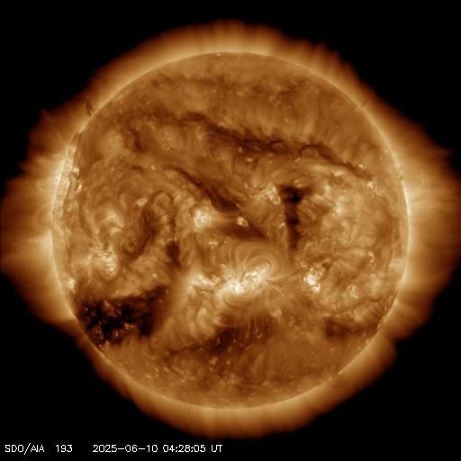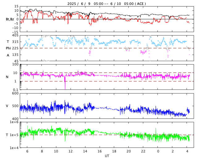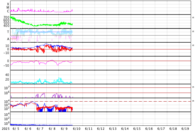 2025/ 6/10 13:38 更新 太陽風は平均的な状態です。太陽は穏やかです。 担当 篠原 昨日のニュースの後、 太陽風の速度は480km/秒くらいまで上がりました。 今日に入ると下がり始めて、 現在は420km/秒と平均的な速度です。 グラフの最後で少し上がっていますが、 目立つ程の変化ではありません。 磁場強度は、10nTから5nTに下がっています。 こちらも平均的な状態です。 磁場の南北成分は、 -5nTくらいの南向きの変化が時々発生しています。 磁気圏の活動もやや活動的で、 AE指数は500nTの中規模の変化が繰り返し発生しています。 SDO衛星AIA193の太陽コロナ写真では、 南東側(左下)のコロナホールが良く見えるようになって言います。 27日周期の図を見ると、 前周期は5月17日から高速太陽風が始まりました。 この27日後と考えると、6月13日です。 今回も同じ様なタイミングで太陽風の速度が高まるでしょうか。 太陽は、南西(右下)の4107黒点群で、 C3.5の小規模フレアが発生しています。 その他は目立った変化はなく、太陽は穏やかな状態です。