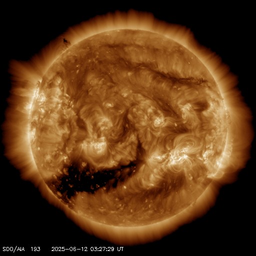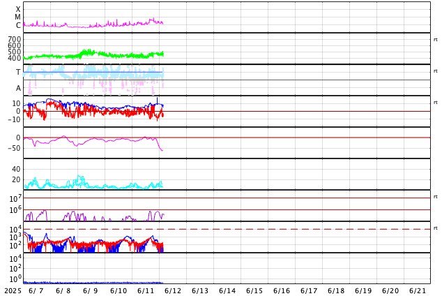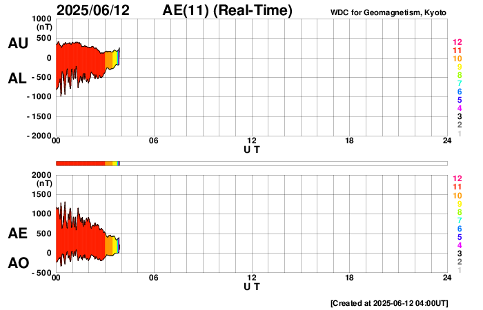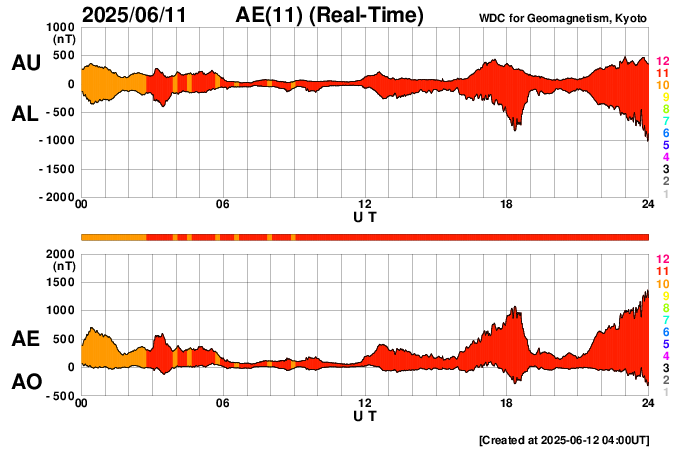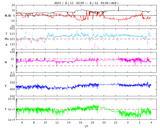 2025/ 6/12 13:18 更新 太陽風磁場が南向きに強まって、磁気圏の活動が強まっています。 担当 篠原 太陽風は、速度は420km/秒、磁場強度は5nTと 平均的な状態でしたが、 12日0時(世界時11日15時)頃に小さい変化がやって来て、 速度は小幅ですが460km/秒へ、 磁場強度は9nTへ高まっています。 磁場の南北成分は、変化の後は南向きに強まり、 -8nT程度の変化が続いています。 このため磁気圏の活動が強まって、 AE指数は、1000〜1300nTの大きい変化が 半日ほど続いています。 SDO衛星AIA193では、 南東側に大きいコロナホールが見えています。 2〜3日後くらいから太陽風の速度が高まりそうです。 注目して下さい。 太陽は、南西(右下)の4105黒点群でC6.3、 北東の端(左上)でC8.5、 南西の4107群で、C3.4、C3.2 などの小規模フレアが発生しています。 北東の端には新しい黒点が現れています。 この後も活動は続くでしょうか。