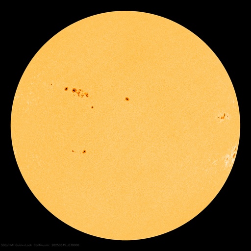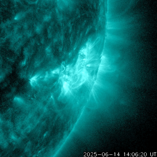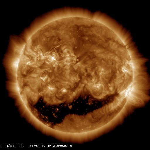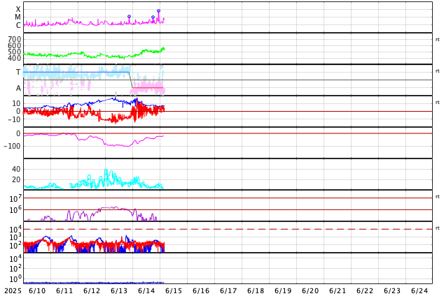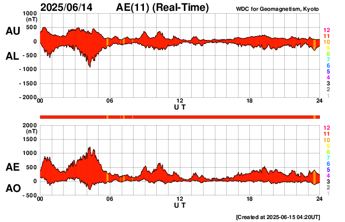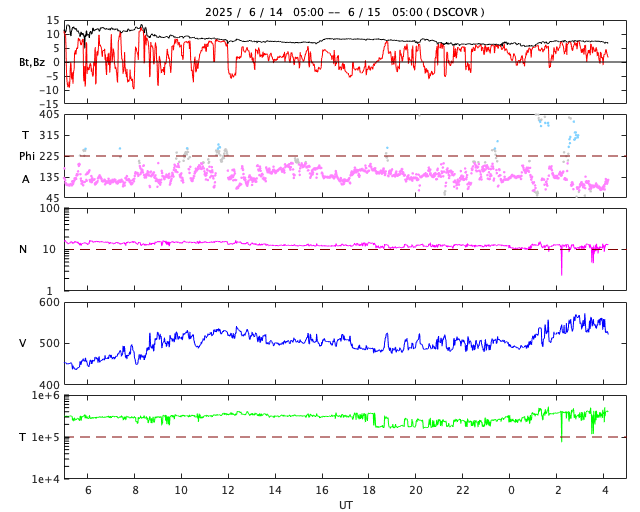 2025/ 6/15 13:28 更新 高速の太陽風が到来して、550km/秒に高まっています。磁気圏は穏やかです。 担当 篠原 太陽風の速度は、 昨日のニュースの後450km/秒から500km/秒に高まり、 高速の状態に達しました。 SDO衛星AIA193の南半球に見えていた コロナホールの影響が始まった様です。 太陽風の速度は、グラフの最後で550km/秒へ高まっています。 27日周期の図を見ると、 前周期の高速風は、5月17日に700km/秒まで高まっています。 今回の高速風はどの様に推移するでしょうか。 太陽風の磁場強度は、12nTから7nTへ下がっています。 南北成分は、グラフの前半は南北に変化していますが、 中盤で0nT付近になり、後半は北寄りで推移しています。 磁気圏の活動もこれに対応していて、 AE指数は次第に変化が小さくなり、 最後は穏やかになっています。 SDO衛星AIA193の太陽コロナ写真を見ると、 南半球のコロナホールは、 南東の端(左下)にかけて大きく広がっています。 影響はしばらく続きそうです。 太陽は、南西の端(右下)に近付いた4105黒点群で、 15日3時(世界時14日18時)にM1.0、 15日8時(世界時14日23時)にM6.8と、 中規模フレアが2回発生しています。 SDO衛星AIA131の動画を掲載します。 中心部北東側の4113、4114群も、 C4.9、C4.3、C8.3、C7.5と小規模フレアが続いています。 中心に近いので注目して下さい。
