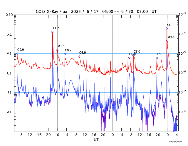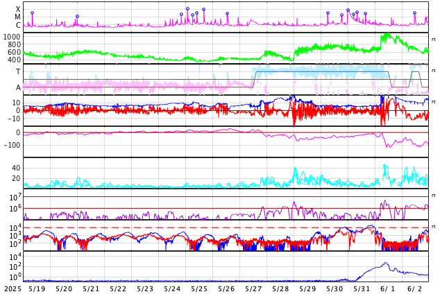 GOES衛星の太陽X線強度。赤・橙 = 0.1〜0.8 nm、青・紫 = 0.05〜0.4 nm (c) データ:NOAA/SWPC、作図:宇宙天気ニュース ![]() | |||||||||||||||||||||||||||||||||||||||||||||||||||||||||||||||||||||||||||||||||||||||||||||||||||||||||||||||||||||||||||||||||||||||||||||||||||||||||||||||||||||||||||||||||||||||||||||||||||||||||||||||||||||||||||||||||||||||||||||||||||||||||||||||||||||||||||||||||||||||||||||||||||