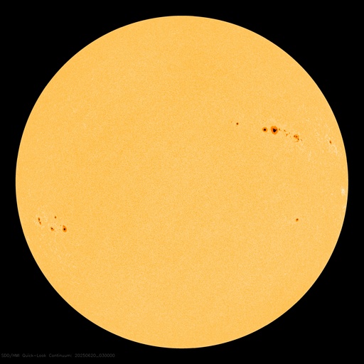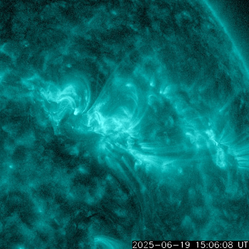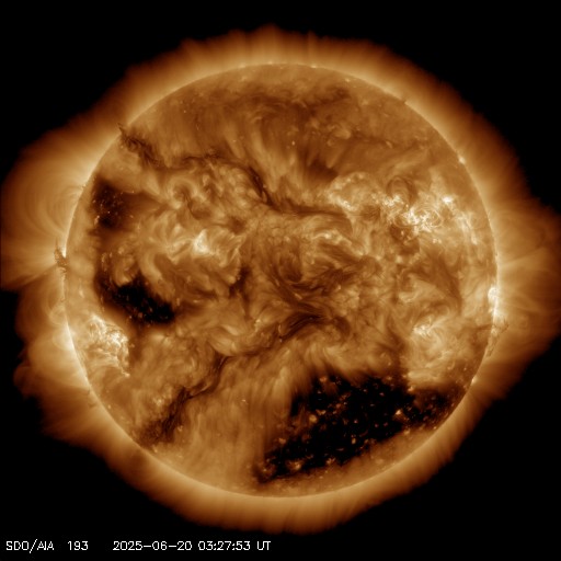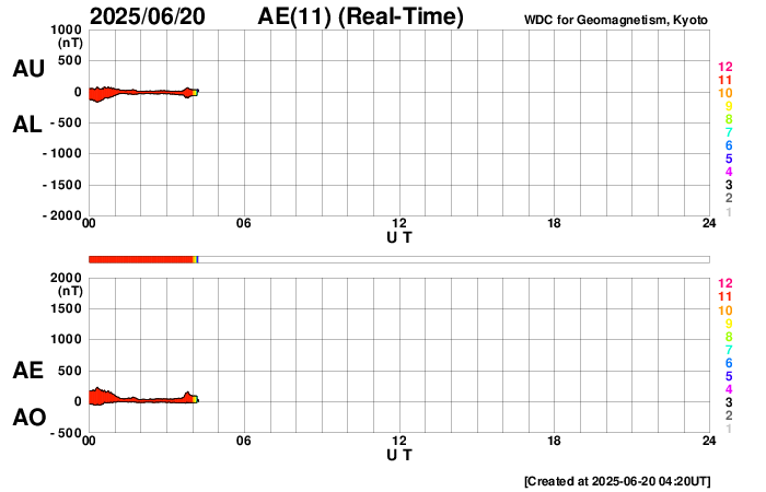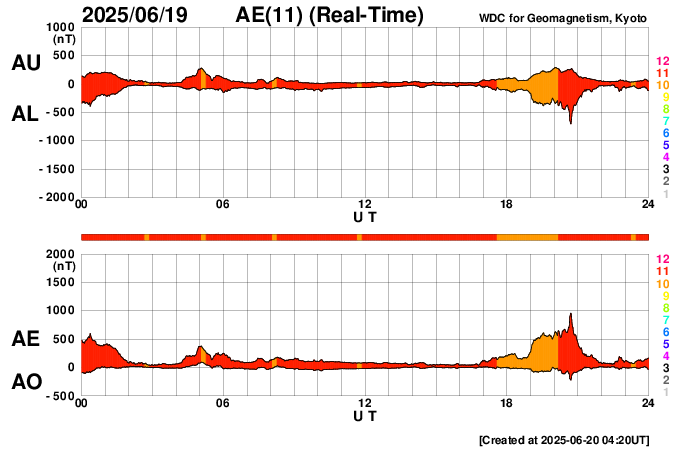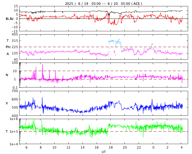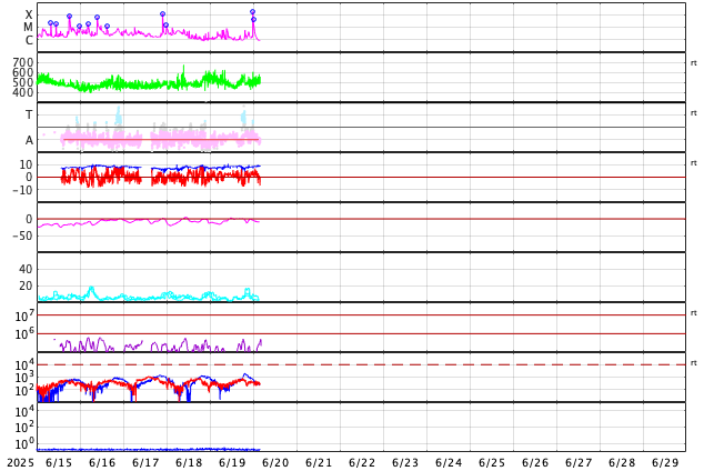 2025/ 6/20 13:21 更新 X1.9の大規模フレアが発生しました。太陽風は高速の状態が続いています。 担当 篠原 今朝、20日8時半(世界時19日23時半)に、 太陽の北西側(右上)の4114黒点群で、 X1.9の大規模フレアが発生しました。 4114群では、世界時17日のX1.2に続くXフレアです。 SDO衛星AIA131の動画を掲載します。 CME(コロナ質量放出)は特に起きていない様です。 その他の領域では、 南東(左下)の4117群でCC5.9、 南西(右下)の4116群でC4.4の小規模フレア などが発生しています。 太陽風は、500km/秒前後と高速の状態が続いています。 磁場強度は、8nTから9nTへ少し強まっています。 磁場の南北成分は、弱い北寄りになっていて、 グラフの中ほどと最後で南向きの変化が発生しています。 磁気圏は基本的に穏やかで、 磁場が南向きになった頃に AE指数で600nTくらいの変化が発生しています。 SDO衛星AIA193では、 南半球のコロナホールは南西側に進んでいて、 影響はもう4日くらいでしょうか。 一方、東側(左側)の赤道付近から北側に コロナホールが伸びています。 次の高まりはこの領域の影響になりそうです。