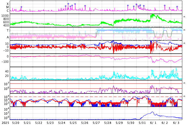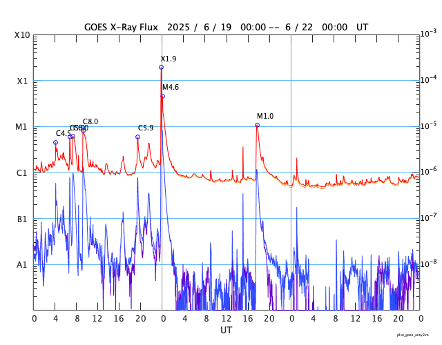 GOES衛星の太陽X線強度。赤・橙 = 0.1〜0.8 nm、青・紫 = 0.05〜0.4 nm (c) データ:NOAA/SWPC、作図:宇宙天気ニュース ![]() | |||||||||||||||||||||||||||||||||||||||||||||||||||||||||||||||||||||||||||||||||||||||||||||||||||||||||||||||||||||||||||||||||||||||||||||||||||||||||||||||||||||||||||||||||||||||||||||||||||||||||||||||||||||||||||||||||||||||||||||||||||
