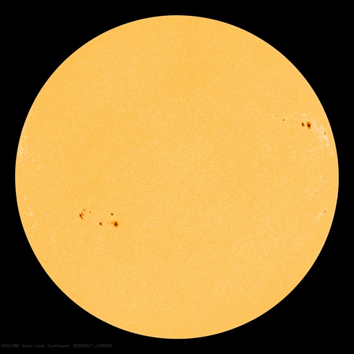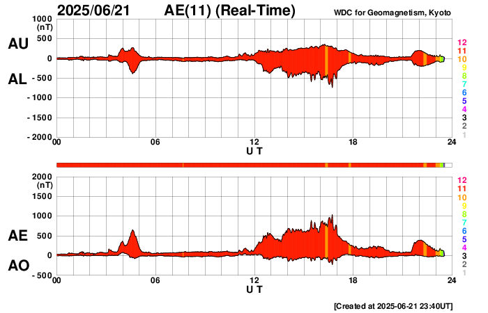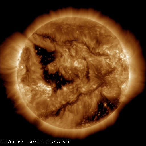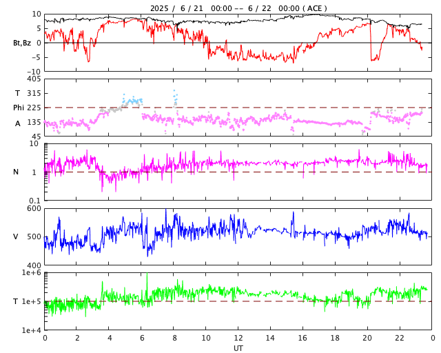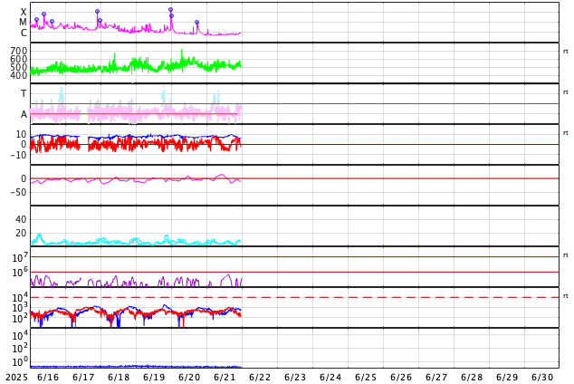2025/ 6/22 08:56 更新 太陽風は高速の状態が続いています。太陽は穏やかです。 担当 篠原 太陽風の速度は、520km/秒前後と高速の状態が続いています。 磁場強度は、8nTとやや強まった状態から、 グラフの最後で6nTへ少し下がっています。 太陽風磁場の南北成分は、北を向いたり南を向いたり、 ゆっくり変化しています。 南を向いた時間帯に磁気圏の活動が強まって、 AE指数は、500〜1000nTの中規模の変化が続いたり、 その他は変化が小さくなったりしています。 SDO衛星AIA193の太陽コロナ写真では、 南半球のコロナホールは南西の端(右下)にだいぶ進んでいて、 この後影響が終わりそうです。 一方、東側(左側)で縦に伸びているコロナホールが 太陽の中心に近付いています。 3〜4日後くらいから この領域の影響で太陽風の速度が高まりそうです。 27日周期の図を見ると、 前周期は5月28日から速度が高まっています。 この変化の回帰になりそうです。 太陽は、X線グラフは変化が見られなくなっていて、 穏やかになっています。