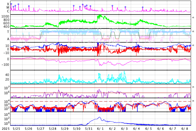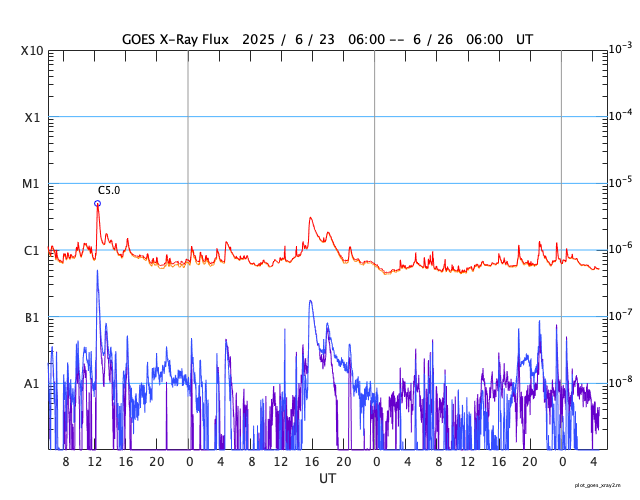 GOES衛星の太陽X線強度。赤・橙 = 0.1〜0.8 nm、青・紫 = 0.05〜0.4 nm (c) データ:NOAA/SWPC、作図:宇宙天気ニュース ![]() | ||||||||||||||||||||||||||||||||||||||||||||||||||||||||||||||||||||||||||||||||||||||||||||||||||||||||||||||||||||||||||||||||||||||||||||||||||||||||||||||||||||||||||||||||||||||||||||||||||||||||||||||||||||||||||||||||