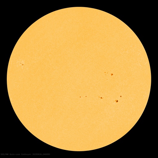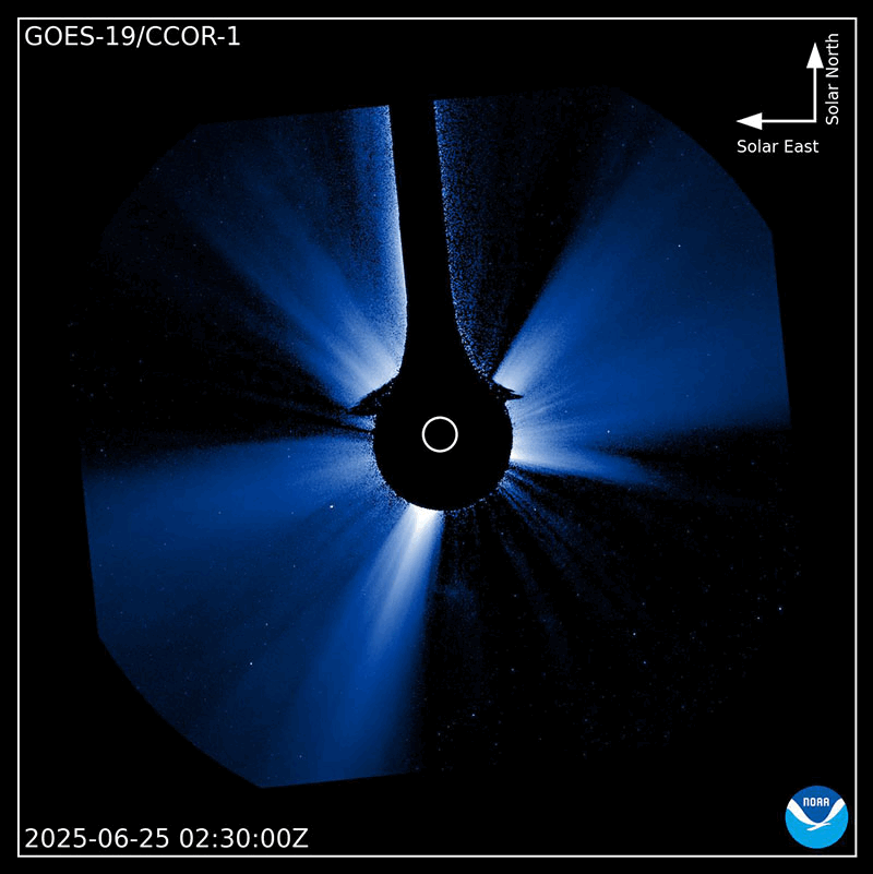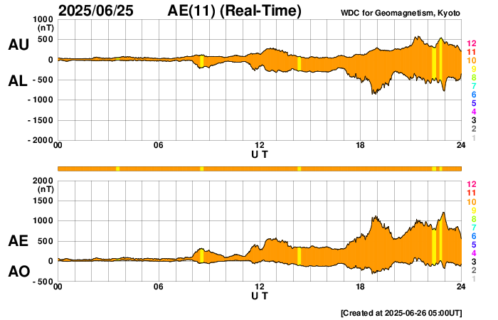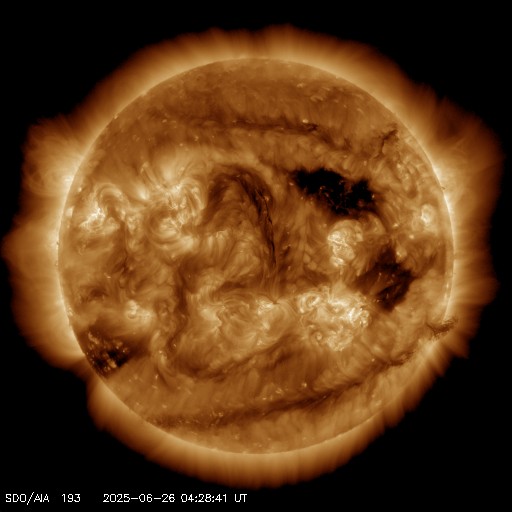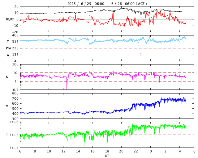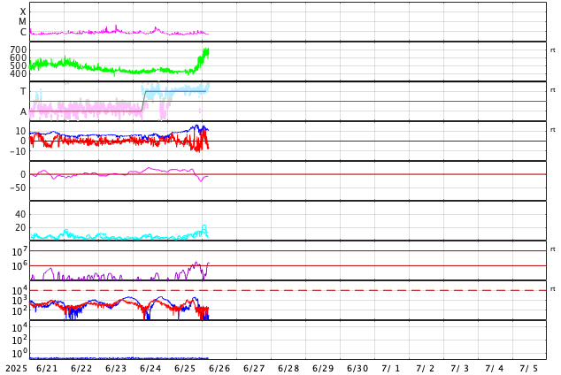 2025/ 6/26 14:04 更新 高速太陽風が到来し、速度は680km/秒に高まっています。 担当 篠原 GOES衛星のコロナグラフで、 新月が画面を横切る様子が見えていました。 この話題はspaceweather.comの2月28日の記事で紹介されていて、 気になっていたのですが、ちょうど見かけました。 新月なのに月の模様が見えているのは、 地球による太陽光の反射、地球照のためです。 今朝、26日4時(世界時25日19時)頃から太陽風の速度が高まり、 430km/秒と平均的な状態から、 680km/秒と高速の状態に変わっています。 SDO衛星AIA193で見えていた コロナホールの影響が始まった様です。 27日周期の図を見ると、 前周期よりも1〜2日ほど遅れて高速風が始まりました。 速度の高まりとしては、前回と同じくらいです。 太陽風磁場は、昨日のニュースの後10nTに強まり、 速度の高まりの頃に15nTへ強まって、現在は10nTに戻っています。 強まっている状態は続いています。 南北成分は、速度が高まる少し前に-10nTと南向きに強まり、 AE指数は1000nTに達する大きい変化が発生しています。 その後磁場は北向きに切り替わって、 グラフの最後は再び南向きになっています。 この後はどちら寄りで推移するでしょうか。 速度が高まっているので、 南寄りになると磁気圏の活動も活発になるでしょう。 太陽は穏やかな状態が続いています。 X線グラフは特に変化は見られません。
