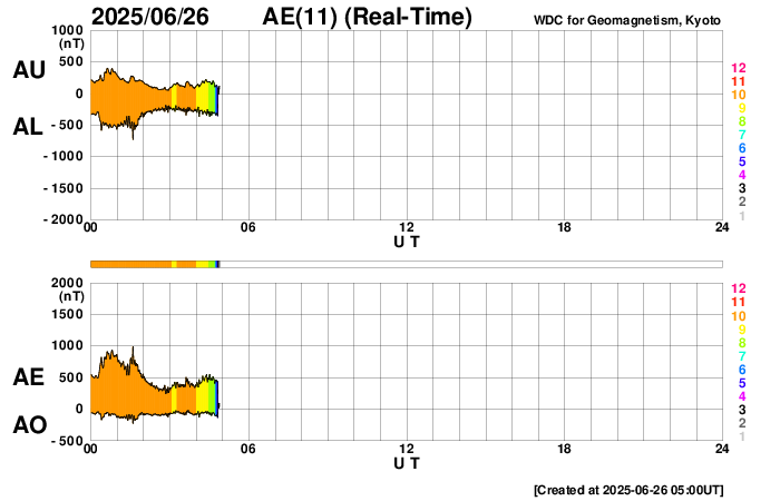 (c) NOAA/SWPC ![]() SDO衛星のAIA193カメラによる太陽コロナの様子 (c) SDO (NASA) ![]() SDO衛星による太陽の可視光写真。マウスの矢印を写真に重ねると、黒点番号付きの写真に切り替わります。 (c) SDO (NASA) ![]() ACEが観測した太陽風の磁場(黒線は全体の強度、赤線は南北成分) 磁場の向き、プラズマの密度、速度、温度 (c) データ:NOAA/SWPC、作図:宇宙天気ニュース ![]() AE指数(速報値) 下段のAEグラフの値が高くなると、オーロラ活動が活発化しています。 (c) 京都大学WDC ![]() ![]() 27日の太陽周期に合わせた図 太陽が同じ面を地球に向けていた27日前の変化から、今後を予想することができます。 (c) 作図:宇宙天気ニュース
