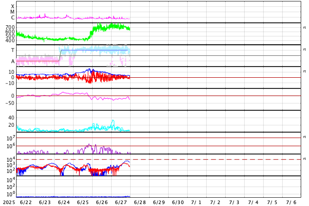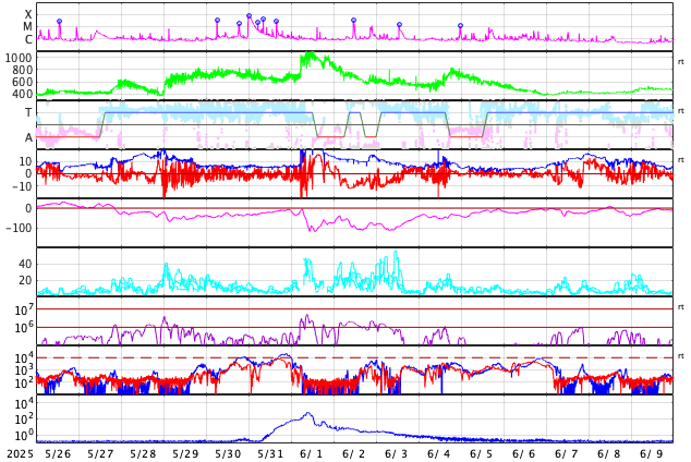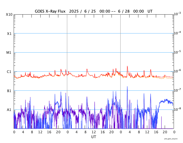 GOES衛星の太陽X線強度。赤・橙 = 0.1〜0.8 nm、青・紫 = 0.05〜0.4 nm (c) データ:NOAA/SWPC、作図:宇宙天気ニュース ![]() | ||||||||||||||||||||||||||||||||||||||||||||||||||||||||||||||||||||||||||||||||||||||||||||||||||||||||||||||||||||||||||||||||||||||||||||||||||||||||||||||||||||||||||||||||||||||||||||||||||||||||||||||||||||||||||||||