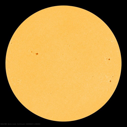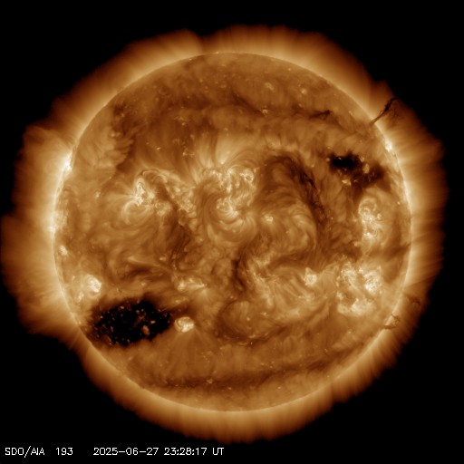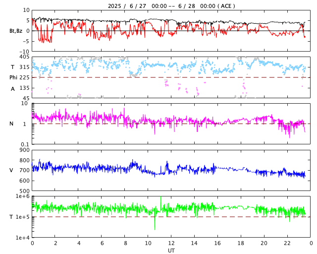 2025/ 6/28 08:44 更新 太陽風は高速の状態が続いていますが、速度は下がり始めています。 担当 篠原 太陽風の速度は、 730km/秒から670km/秒へゆっくりと下がっていますが、 かなり高まった状態は続いています。 磁場強度も6nTから4nTへゆっくりと下がっています。 こちらは平均的な状態です。 高速風の領域としては、後半に入っている様です。 SDO衛星AIA193では、 北半球のコロナホールは北西の端(右上)に近付いています。 一方、南東(左下)のコロナホールが太陽の中心線に近付いています。 4日後くらいからこちらの影響が始まりそうです。 太陽風磁場の南北成分は、南北に変化していますが、 磁場強度が下がってきたこともあり、 南向きの変化は次第に小さくなっています。 磁気圏の活動は活発な状態が続いていますが、 こちらも変化は次第に小さくなっている様です。 AE指数は、前半は1000nTに達する大きい変化が発生していますが、 後半は500nT前後の変化になっている様です。 太陽は穏やかで、 C1台の小さいフレアが数回発生した程度です。 可視光写真では、新しい黒点があちこちに現れています。 ![]() SDO衛星のAIA193カメラによる太陽コロナの様子 (c) SDO (NASA) ![]() SDO衛星による太陽の可視光写真。マウスの矢印を写真に重ねると、黒点番号付きの写真に切り替わります。 (c) SDO (NASA) ![]() ACEが観測した太陽風の磁場(黒線は全体の強度、赤線は南北成分) 磁場の向き、プラズマの密度、速度、温度 (c) データ:NOAA/SWPC、作図:宇宙天気ニュース ![]() AE指数(速報値) 下段のAEグラフの値が高くなると、オーロラ活動が活発化しています。 (c) 京都大学WDC ![]() 27日の太陽周期に合わせた図 太陽が同じ面を地球に向けていた27日前の変化から、今後を予想することができます。 (c) 作図:宇宙天気ニュース