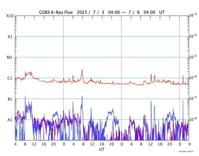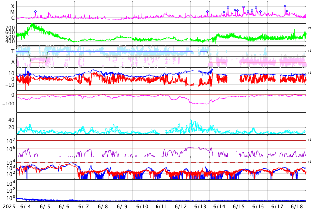 GOES衛星の太陽X線強度。赤・橙 = 0.1〜0.8 nm、青・紫 = 0.05〜0.4 nm (c) データ:NOAA/SWPC、作図:宇宙天気ニュース ![]() | ||||||||||||||||||||||||||||||||||||||||||||||||||||||||||||||||||||||||||||||||||||||||||||||||||||||||||||||||||||||||||||||||||||||||||||||||||||||||||||||||||||||||||||||||||||||||||||||||||||||||||||||||||||||||||||||||||||
