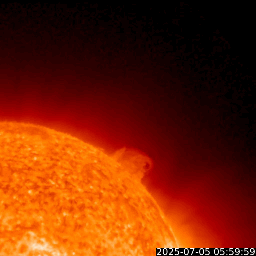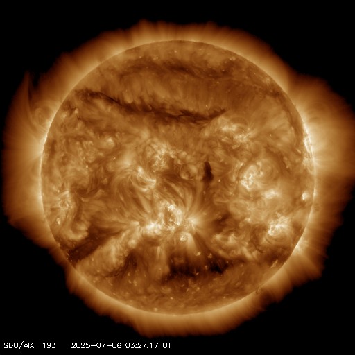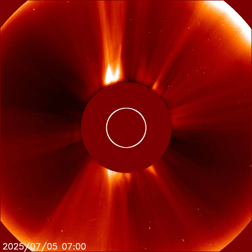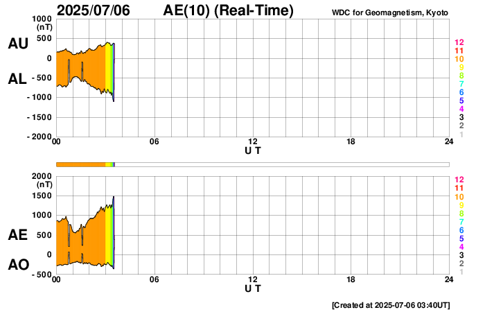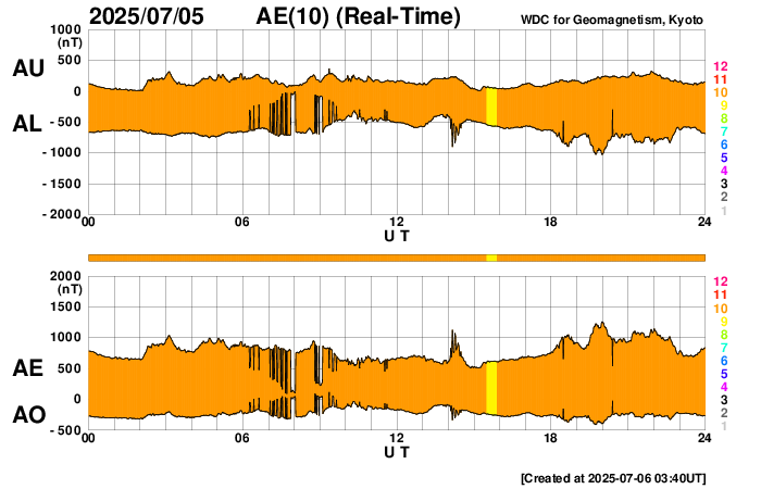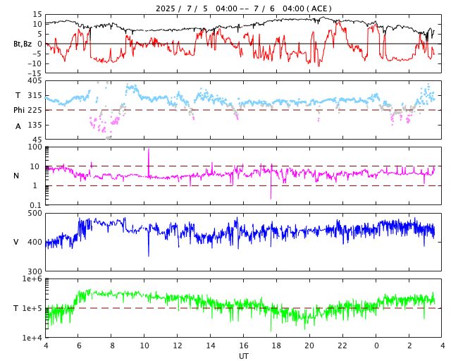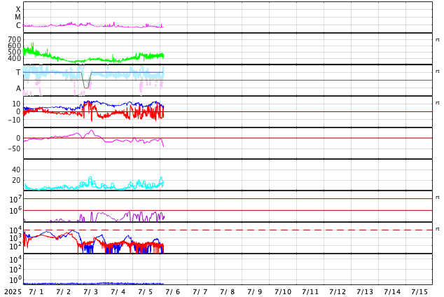 2025/ 7/ 6 12:50 更新 太陽風は平均的な状態です。磁場が南向きに変化して磁気圏の活動が強まっている様です。 担当 篠原 太陽風の速度は、昨日の午後に400km/秒から450km/秒へ少し上がり、 現在もこの状態です。 平均的な速度が続いています。 磁場強度は、10nT前後に強まった状態が続いていましたが、 グラフの最後で5nTと平均的な値に下がっています。 この後もこの状態で推移するのでしょうか。 磁場の南北成分は、 -5nTを超えるくらいの南向きの変化が繰り返し発生しています。 磁気圏の活動はある程度高まっている様で、 AE指数は、グラフの様子から500nTを超えるくらいの変化が 度々発生している様です。 SDO衛星AIA193では、 太陽の中心部は、南側に小さいコロナホールが見える程度で、 太陽風は穏やかな状態が続きそうです。 一方、南東の端(左下)からコロナホールの広がりが見え始めています。 注目して下さい。 太陽は、X線グラフはC1台の小さい変化しか発生していません。 GOES衛星SUVI 304によると、 太陽の北西の端(右上)でプロミネンス噴出が発生しています。 動画を掲載します。 これにより、CME(コロナ質量放出)が発生しています。 SOHO衛星LASCO C2、C3の動画を掲載します。 横向きの噴出なので、地球への影響はありません。