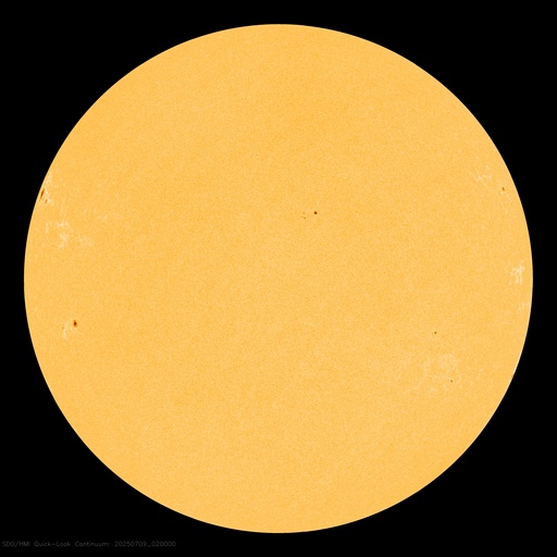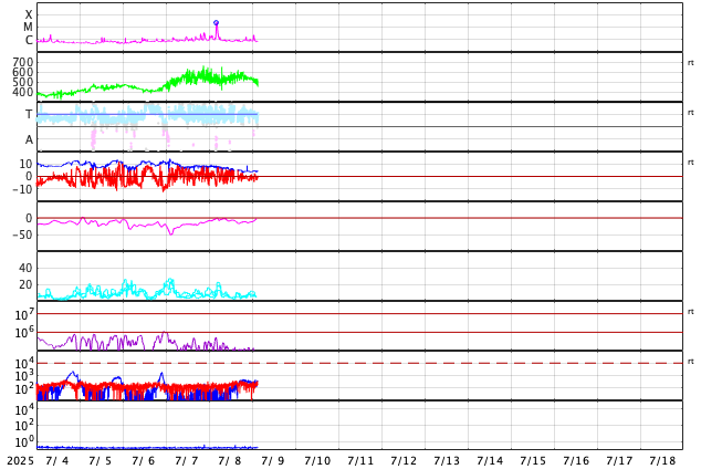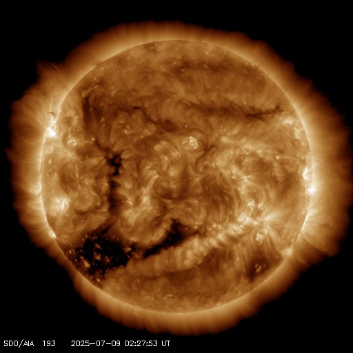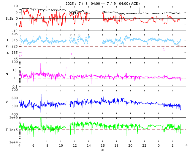 2025/ 7/ 9 12:28 更新 高速の太陽風が続いています。太陽は穏やかな状態です。 担当 篠原 太陽風は高速の風が続いています。 速度は、500km/秒から550km/秒へゆっくり上がり、 その後500km/秒に戻っています。 磁場強度は、8nTから4nTへ下がり、 平均的な状態に戻っています。 磁場の南北成分は、南を向いたり北を向いたり、 細かく変化しています。 AE指数の変化を見ると、 磁気圏では小規模の変化が度々発生しているようです。 SDO衛星AIA193では、 南半球のコロナホールが太陽の中心線に達しています。 3日後くらいからこの領域の影響が始まりそうです。 太陽は、昨日M2.4の中規模フレアを起こしたと思われる黒点群が 北東の端(左上)に現れています。 その後は、C1〜2の小さいフレアを起こした程度です。 太陽は穏やかな状態です。 ![]() SDO衛星のAIA193カメラによる太陽コロナの様子 (c) SDO (NASA) ![]() SDO衛星による太陽の可視光写真。マウスの矢印を写真に重ねると、黒点番号付きの写真に切り替わります。 (c) SDO (NASA) ![]() ACEが観測した太陽風の磁場(黒線は全体の強度、赤線は南北成分) 磁場の向き、プラズマの密度、速度、温度 (c) データ:NOAA/SWPC、作図:宇宙天気ニュース ![]() AE指数(速報値) 下段のAEグラフの値が高くなると、オーロラ活動が活発化しています。 (c) 京都大学WDC ![]() ![]() 27日の太陽周期に合わせた図 太陽が同じ面を地球に向けていた27日前の変化から、今後を予想することができます。 (c) 作図:宇宙天気ニュース