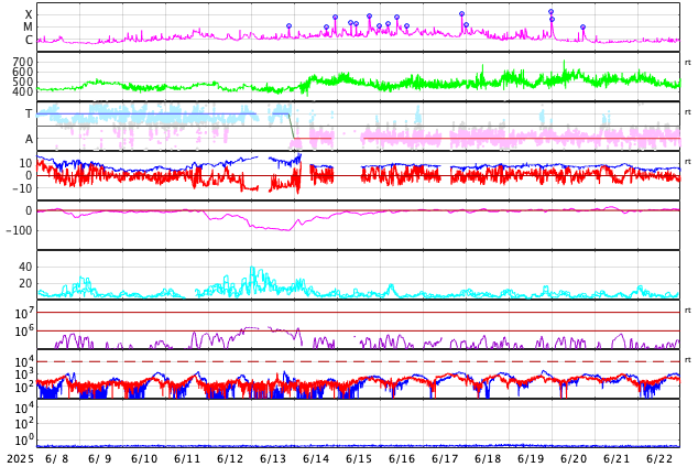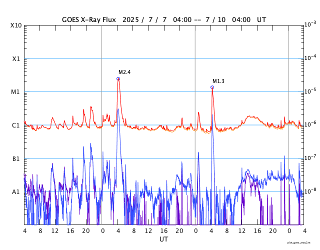 GOES衛星の太陽X線強度。赤・橙 = 0.1〜0.8 nm、青・紫 = 0.05〜0.4 nm (c) データ:NOAA/SWPC、作図:宇宙天気ニュース ![]() | |||||||||||||||||||||||||||||||||||||||||||||||||||||||||||||||||||||||||||||||||||||||||||||||||||||||||||||||||||||||||||||||||||||||||||||||||||||||||||||||||||||||||||||||||||||||||||||||||||||||||||||||||||||||||||||||||||||||||||||