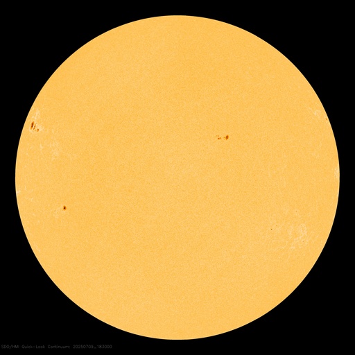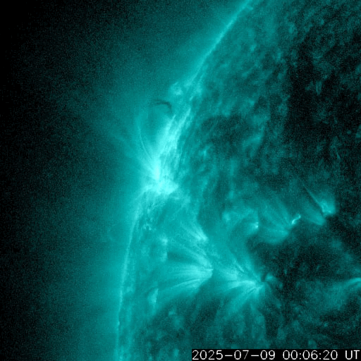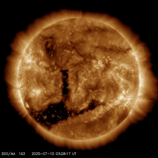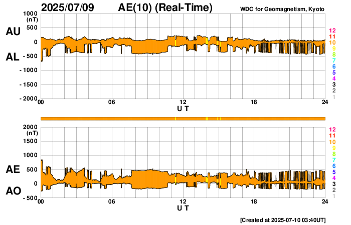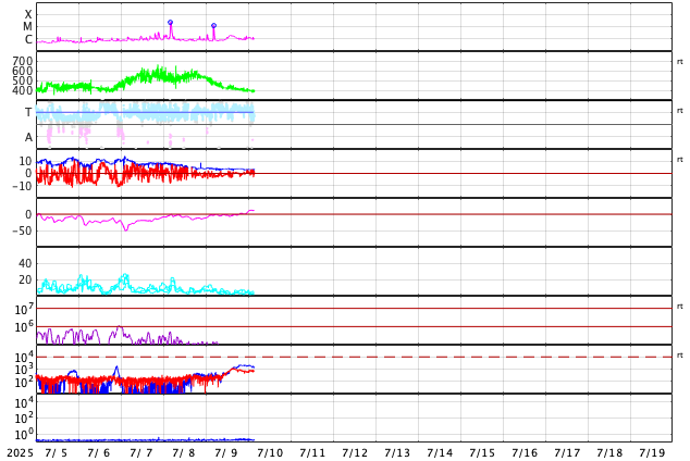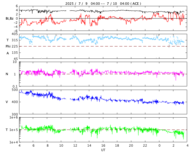 2025/ 7/10 12:41 更新 太陽風は平均的な速度に戻っています。M1.3の中規模フレアが発生しました。 担当 篠原 太陽風の速度は、昨日のニュースの直後に500km/秒台を割り、 今朝、10日7時(世界時9日22時)には400km/秒まで下がりました。 太陽風は平均的な速度に戻っています。 磁場強度は、4nTから3nTへ少し下がり、 やや弱い状態です。 磁場の南北成分は、グラフの前半は弱い南寄りですが、 後半は0nT付近で推移する様になっています。 磁気圏は穏やかになっていて、 AE指数は見にくい状態が続いていますが、 目立った変化は起きていない様です。 SDO衛星AIA193の太陽コロナ写真では、 南半球のコロナホールが次第に南西側(右下)に進んでいます。 明後日くらいから太陽風の速度が高まるかもしれません。 コロナホールは、南東側(左下)でより大きい広がりになっています。 このため、太陽風速度の高まりは、 しばらく経ってからより強まるかもしれません。 太陽は、昨日の昼、9日13時(世界時9日4時)に、 北東の端近く(左上)の4136黒点群で M1.3の中規模フレアが発生しています。 この領域では、8日のM2.4に続くMクラスフレアです。 また、X線グラフでは、9日23時(世界時9日14時)頃に C2に近い規模のゆっくりとした高まりが発生しています。 太陽の南東の端の向こう側で発生したフレアの影響の様です。 この後、活動的な領域が現れるでしょうか。