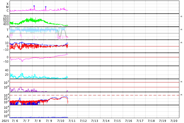 - 2025/ 7/ 7 12:22 太陽風の速度は500km/秒に高まっています。磁場が南向きに強まり、磁気圏の活動が強まっています。