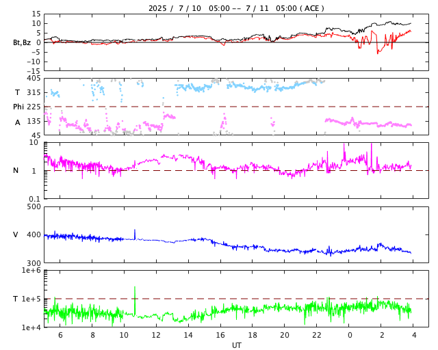 - 2025/ 7/ 6 12:50 太陽風は平均的な状態です。磁場が南向きに変化して磁気圏の活動が強まっている様です。