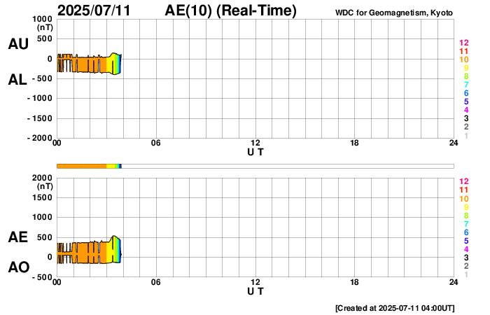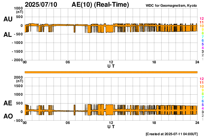 下段のAEグラフの値が高くなると、オーロラ活動が活発化しています。