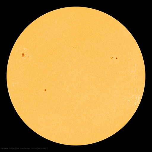 SDO衛星による太陽の可視光写真。マウスの矢印を写真に重ねると、黒点番号付きの写真に切り替わります。