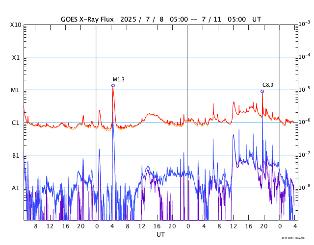 - 2025/ 7/10 12:41 太陽風は平均的な速度に戻っています。M1.3の中規模フレアが発生しました。
