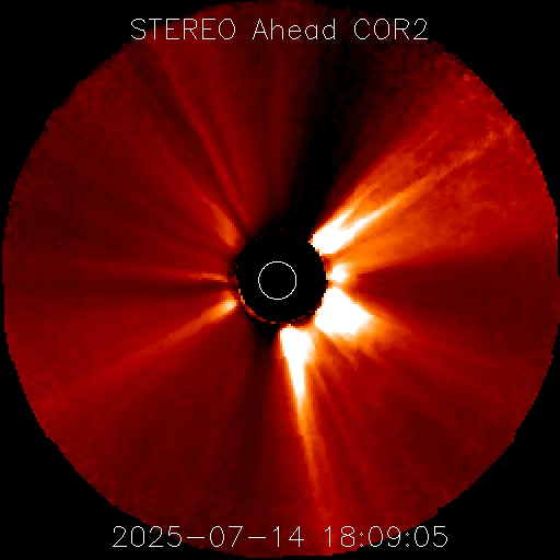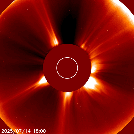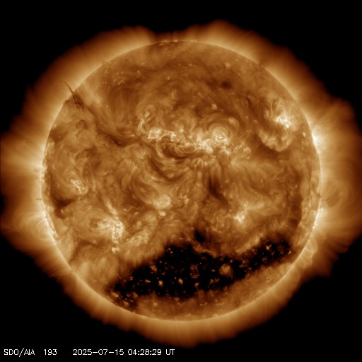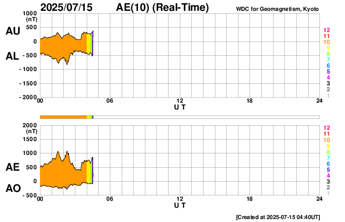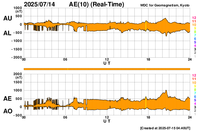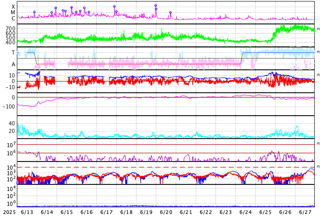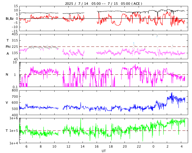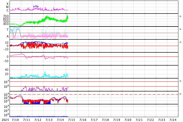 2025/ 7/15 13:47 更新 太陽風の速度は650km/秒に高まっています。磁気圏の活動もある程度強まっています。 担当 篠原 太陽風の速度は、 昨日のニュースの後に500km/秒へ少し下がり、 今朝までこの状態でしたが、 15日9時(世界時15日0時)頃から高まり始めて、 現在は650km/秒です。 高速の状態が続いています。 磁場強度は、7nTから10nTへ強まっています。 SDO衛星AIA 193では、 南半球のコロナホールの広い領域が南西の端(右下)に達しています。 この領域の影響が強まっている様です。 太陽風磁場の南北成分は、 グラフの前半は0nT付近でしたが、 後半から南北に変化する様になり、 -5nTを超える南向きの強まりが発生しています。 この影響で磁気圏の活動が強まり、 AE指数は、1000nTに達するくらいの 中規模の変化が発生している様です。 コロナホールは太陽の南東側(左下)まで広がっています。 高速の太陽風はしばらく続きそうです。 太陽は、今朝、15日5時(世界時14日20時)頃から、 南西側でCME(コロナ質量放出)が下寄りと右下寄りに2つ発生しています。 SOHO衛星LASCO C2、C3の動画を掲載します。 太陽を地球よりも40度ほど右側から観測している STEREO Ahead衛星のCOR2を見ると、 太陽の横側や、向こう側で発生している様です。 X線グラフは目立った変化はありません。 フレアについては穏やかです。