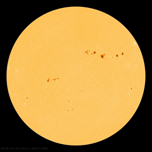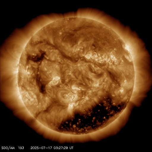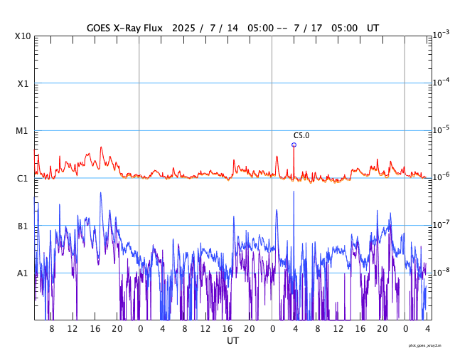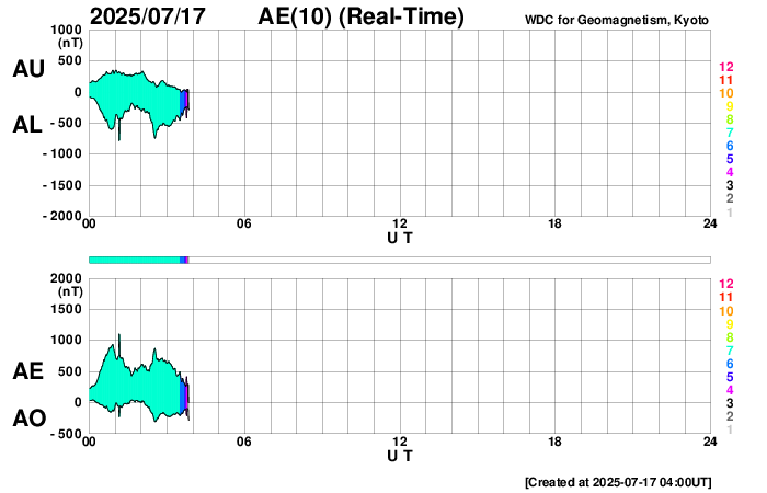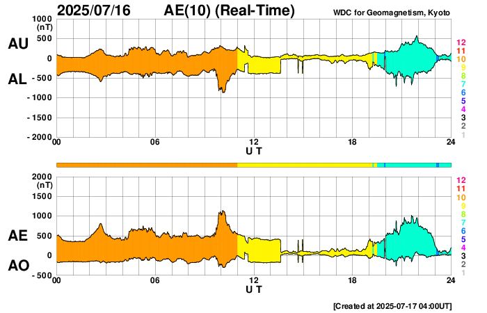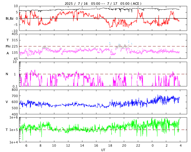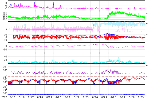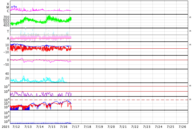 2025/ 7/17 13:04 更新 太陽風の速度は650km/秒に高まっています。磁気圏も活動的です。 担当 篠原 太陽風の速度は、今日未明まで550km/秒で推移していましたが、 その後一段高まって、現在は650km/秒と、 より高速の風に変わっています。 磁場強度は、7〜8nTで安定しています。 磁場の南北成分は、南を向いたり、北を向いたり、 ゆっくり変化しています。 南を向いたところで磁気圏の活動が強まり、 AE指数は1000nT近い中規模の変化が発生しています。 SDO衛星AIA193を見ると、 南半球のコロナホールは左端が中心線近くに達しています。 太陽風速度の高まりは、 3〜4日くらいで終わりに向かうかもしれません。 太陽は穏やかに推移しています。 X線グラフは、昨日のC5.0以降は目立った変化が起きていません。 一方、可視光写真では、黒点群が11群も見えています。 WDC-SILSOの黒点相対数の速報値では、 昨日、16日の値が 204 と200を超えています。 今後修正される可能性がありますが、 200に達したのは4月24日以来で、3か月ぶりです。