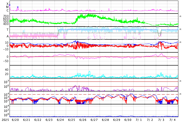 - 2025/ 7/19 09:30 太陽風の速度は530km/秒です。高速ですが、速度はゆっくり低下しています。