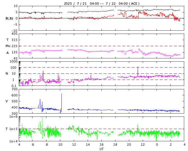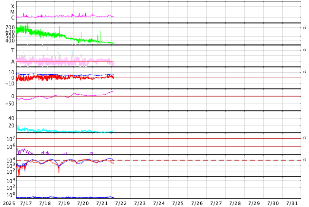 - 2025/ 7/21 08:23 太陽風は平均的な状態で、磁気圏は穏やかです。