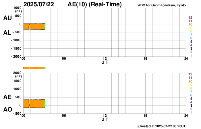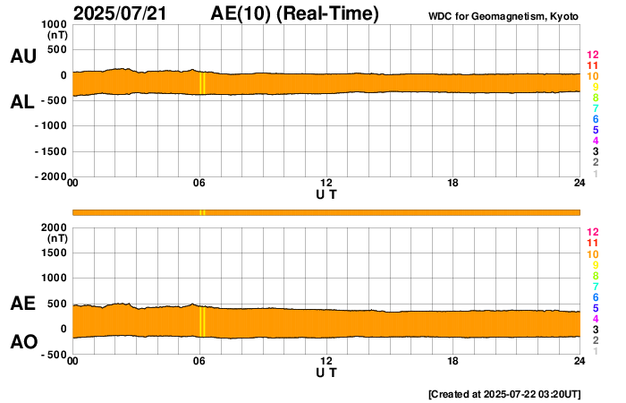 下段のAEグラフの値が高くなると、オーロラ活動が活発化しています。