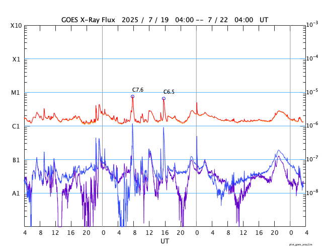 GOES衛星の太陽X線強度。赤・橙 = 0.1〜0.8 nm、青・紫 = 0.05〜0.4 nm
