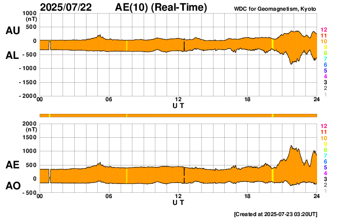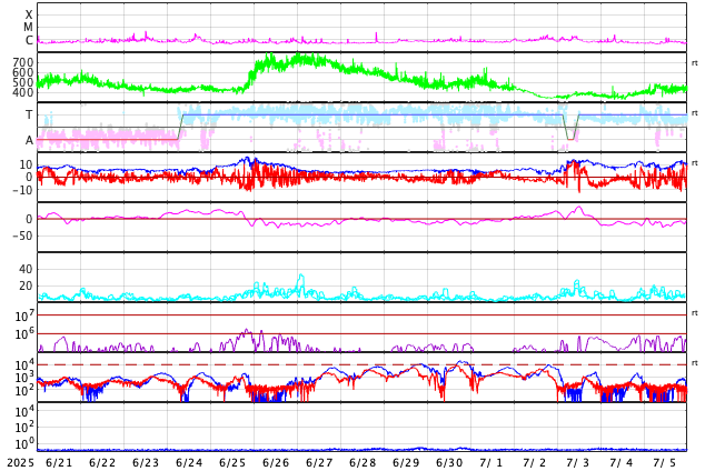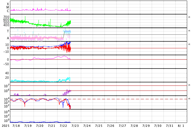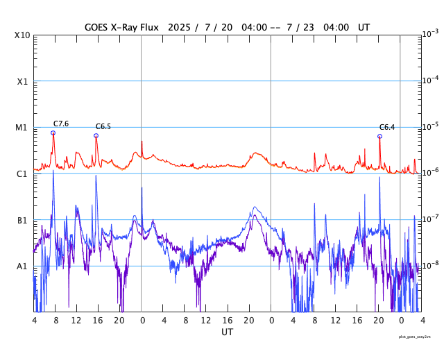 GOES衛星の太陽X線強度。赤・橙 = 0.1〜0.8 nm、青・紫 = 0.05〜0.4 nm (c) データ:NOAA/SWPC、作図:宇宙天気ニュース ![]() | ||||||||||||||||||||||||||||||||||||||||||||||||||||||||||||||||||||||||||||||||||||||||||||||||||||||||||||||||||||||||||||||||||||||||||||||||||||||||||||||||||||||||||||||||||||||||||||||||||||||||||||||||||||||||||||||||||||||||||||||||||