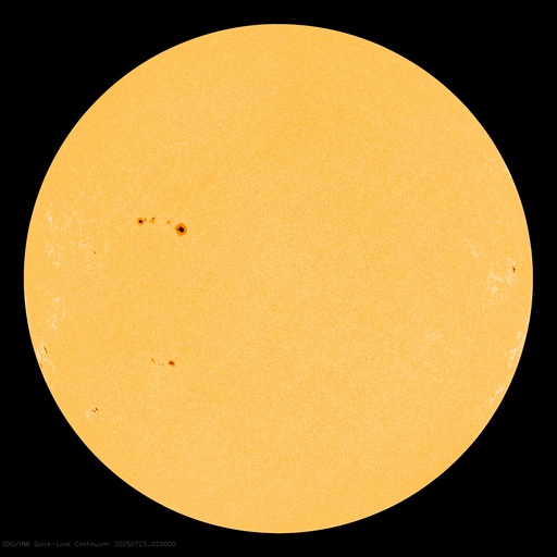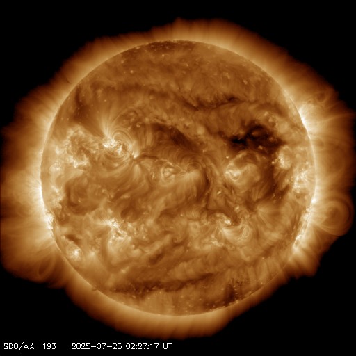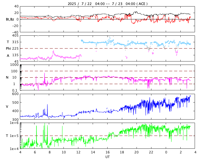 2025/ 7/23 12:32 更新 太陽風の速度は550km/秒に高まっています。磁気圏も活動的です。 担当 篠原 太陽風の速度は、 昨日のニュースの後、330km/秒と低速の状態が続きましたが、 夜になると400km/秒に上がり、 今朝、23日6時(世界時22日21時)には500km/秒に高まって、 高速の状態に変わりました。 グラフの最後は、550km/秒に達しています。 コロナホールの影響が始まった様です。 太陽風の磁場強度は、 昨夜以降15nT前後と強まった状態が続いています。 南北成分は、グラフの後半から南向きに変化が見られる様になり、 速度の高まりと重なって、磁気圏の活動が強まっています。 AE指数は、500〜1000nTくらいの 中規模の変化が発生している様です。 SDO衛星AIA193では、 コロナホールは北西側(右上)に進んでいます。 広がりがあまり大きくないので、 影響は比較的短い時間で終わりそうですが、 どうなるでしょうか。 太陽は、南東(左下)の4150黒点群で、 C6.4の小規模フレアが発生しています。 その他は目立った活動はなく、太陽は穏やかな状態です。 ![]() SDO衛星のAIA193カメラによる太陽コロナの様子 (c) SDO (NASA) ![]() SDO衛星による太陽の可視光写真。マウスの矢印を写真に重ねると、黒点番号付きの写真に切り替わります。 (c) SDO (NASA) ![]() ACEが観測した太陽風の磁場(黒線は全体の強度、赤線は南北成分) 磁場の向き、プラズマの密度、速度、温度 (c) データ:NOAA/SWPC、作図:宇宙天気ニュース ![]() AE指数(速報値) 下段のAEグラフの値が高くなると、オーロラ活動が活発化しています。 (c) 京都大学WDC ![]() ![]() 27日の太陽周期に合わせた図 太陽が同じ面を地球に向けていた27日前の変化から、今後を予想することができます。 (c) 作図:宇宙天気ニュース