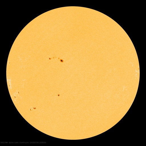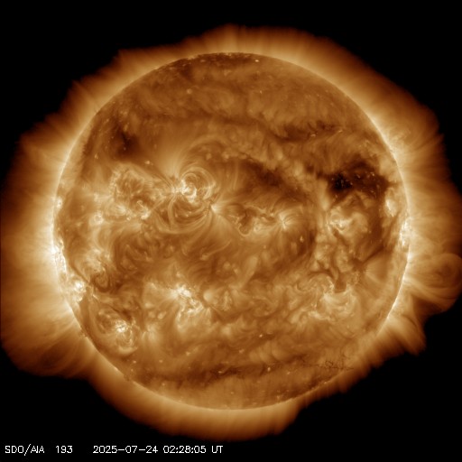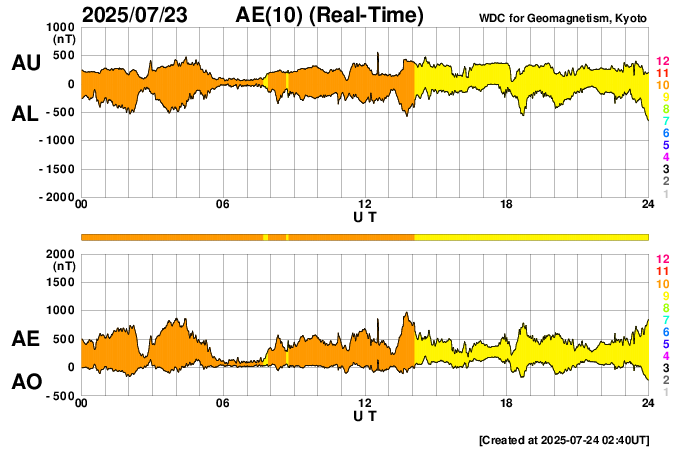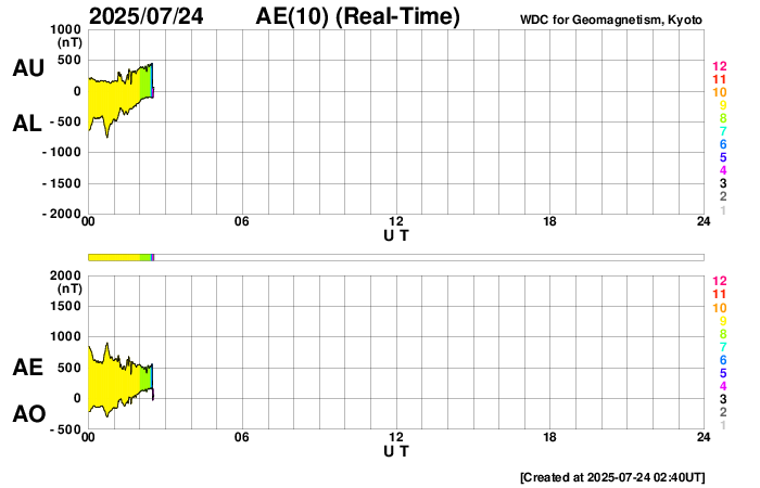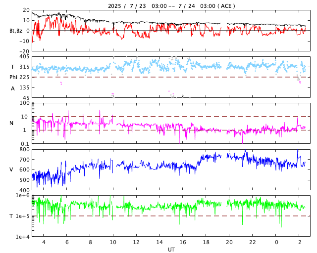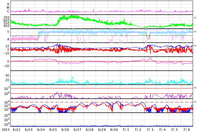 2025/ 7/24 11:46 更新 太陽風の速度は730km/秒まで高まりました。現在も640km/秒と高速です。 担当 篠原 太陽風の速度は更に高まっています。 昨日の午後、23日15時(世界時23日6時)頃に600km/秒台へ、 そして、今日未明、24日3時(世界時23日18時)頃に700km/秒台に達しました。 その後、730km/秒まで高まり、 以降はゆっくりと低下して、現在は640km/秒辺りです。 太陽風の磁場強度は、速度の変化と反対に、 15nTと強まった状態から次第に低下して、 現在は5nTと平均的な値まで下がっています。 この様子から、高速太陽風の領域としては、 速度の高まりのピークを迎えている様です。 磁場の南北成分は、南北に変化が発生していて、 AE指数は、500nTを超えるくらいの中規模の変化が続いています。 太陽風の磁場強度が下がって来たので、 この後は、磁気圏活動の規模も下がりそうです。 SDO衛星AIA193では、 コロナホールは北西側(右上)にだいぶ進んでいます。 太陽風への影響は次第に小さくなりそうです。 一方、太陽の中心部や東側(左側)にはコロナホールは見えていません。 今回の高速風の後は、太陽風は穏やかな状態がしばらく続きそうです。 太陽は穏やかな状態が続いています。 X線グラフは、C1〜2の小さい変化が起きている程度です。 ![]() SDO衛星のAIA193カメラによる太陽コロナの様子 (c) SDO (NASA) ![]() SDO衛星による太陽の可視光写真。マウスの矢印を写真に重ねると、黒点番号付きの写真に切り替わります。 (c) SDO (NASA) ![]() ACEが観測した太陽風の磁場(黒線は全体の強度、赤線は南北成分) 磁場の向き、プラズマの密度、速度、温度 (c) データ:NOAA/SWPC、作図:宇宙天気ニュース ![]() AE指数(速報値) 下段のAEグラフの値が高くなると、オーロラ活動が活発化しています。 (c) 京都大学WDC ![]() ![]() 27日の太陽周期に合わせた図 太陽が同じ面を地球に向けていた27日前の変化から、今後を予想することができます。 (c) 作図:宇宙天気ニュース
