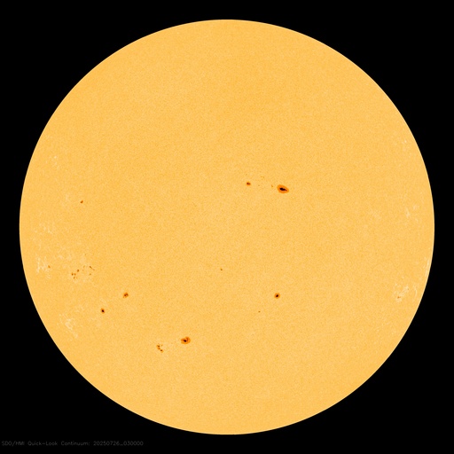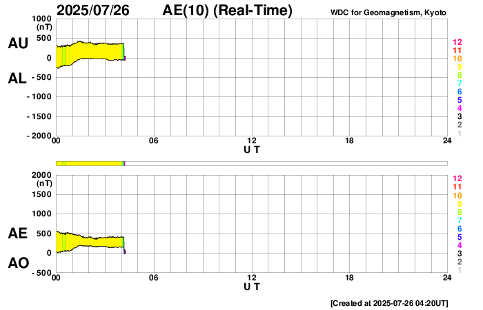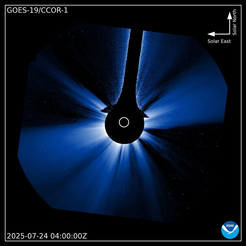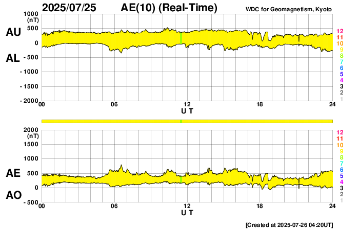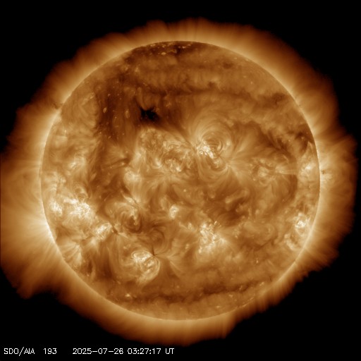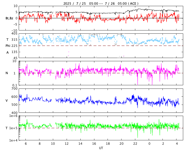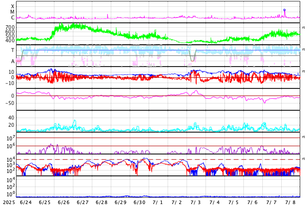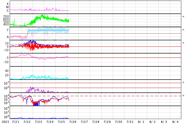 2025/ 7/26 13:34 更新 太陽風の速度は520km/秒に下がっています。高速の太陽風は続いています。 担当 篠原 昨日紹介したGOES衛星のコロナグラフを横切る月の動画の 完全版を掲載します。 次の新月は8月23日です。 この時はどの様に見えるのでしょうか。 太陽風の速度は、 570km/秒から520km/秒程度へゆっくりと下がっています。 高速の状態は続いています。 磁場強度は、5nTの状態から、 グラフの後半で8nTへ少し強まり、現在は6nTです。 SDO衛星AIA193では、 北西(右上)のコロナホールはほとんど見えなくなっています。 太陽風の速度はこの後も下がって、 穏やかな風に変わりそうです。 太陽は穏やかになっています。 X線グラフはほとんど変化がありません。