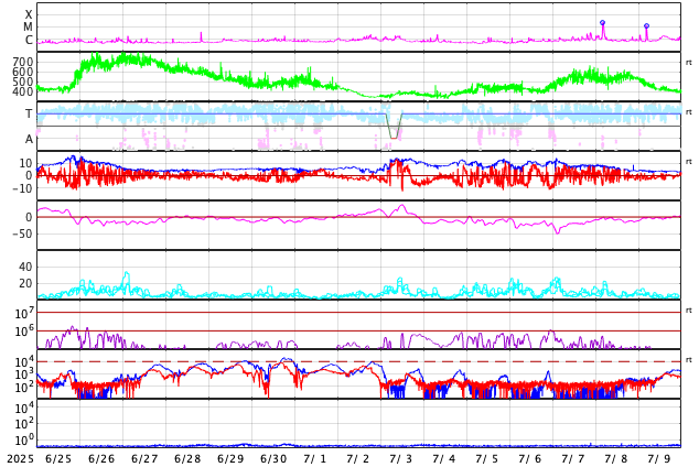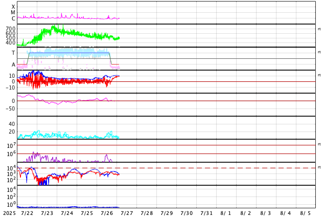 - 2025/ 7/23 12:32 太陽風の速度は550km/秒に高まっています。磁気圏も活動的です。