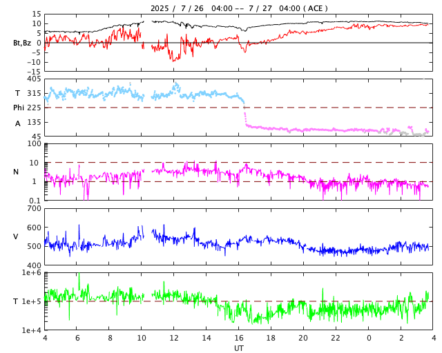 - 2025/ 7/26 13:34 太陽風の速度は520km/秒に下がっています。高速の太陽風は続いています。