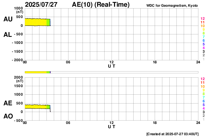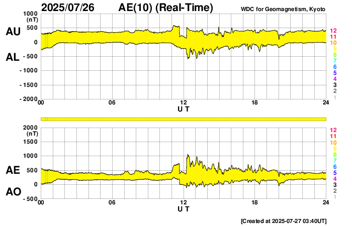 下段のAEグラフの値が高くなると、オーロラ活動が活発化しています。