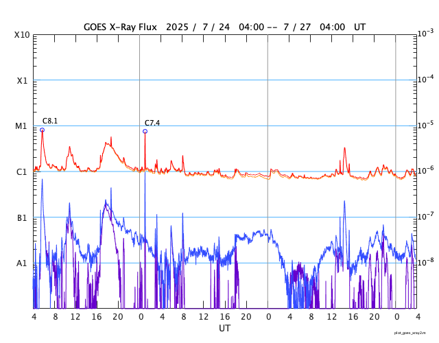 GOES衛星の太陽X線強度。赤・橙 = 0.1〜0.8 nm、青・紫 = 0.05〜0.4 nm