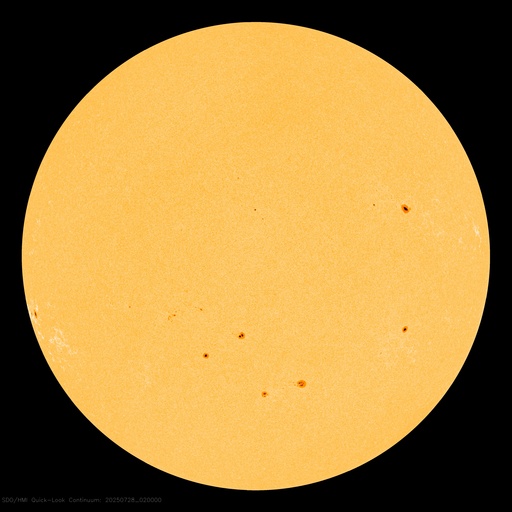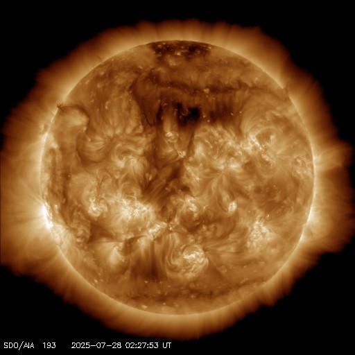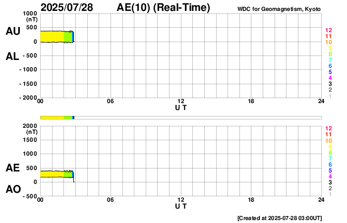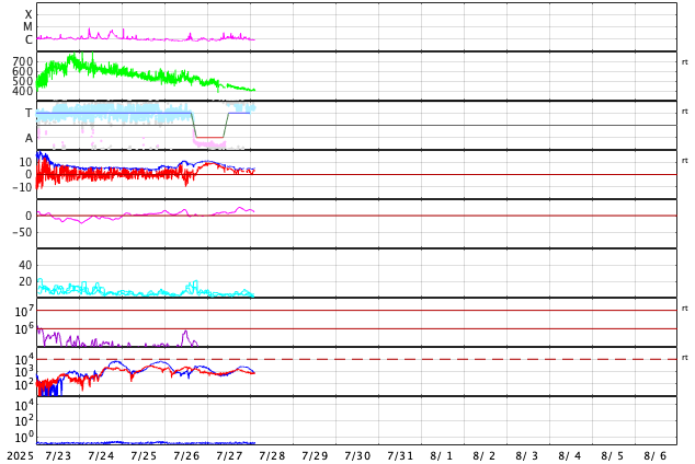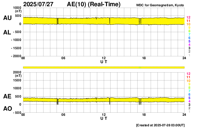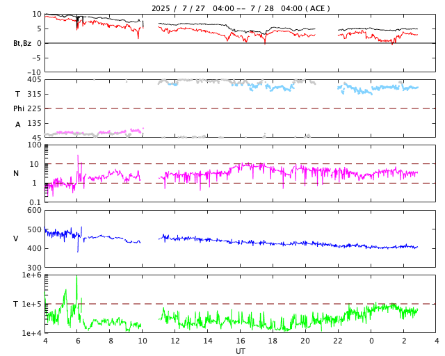 2025/ 7/28 12:03 更新 太陽風は平均的な速度に戻っています。磁気圏は穏やかです。 担当 篠原 太陽風の速度は、500km/秒から400km/秒へ下がっています。 高速の状態は終わり、平均的な速度に戻っています。 磁場強度も10nTから5nTへ下がって、 こちらも平均的な値です。 磁場の南北成分は、北向きの傾向が続いています。 磁気圏は穏やかで、 AE指数は、全体が太くなっていますが、 変化はほとんどありません。 SDO衛星AIA193は、 北半球の高緯度寄りに小さいコロナホールがあるくらいです。 この後、太陽風は穏やかな状態が続きそうです。 太陽は、C2〜3の小規模フレアが数回発生しています。 全体としては穏やかな状態です。 ![]() SDO衛星のAIA193カメラによる太陽コロナの様子 (c) SDO (NASA) ![]() SDO衛星による太陽の可視光写真。マウスの矢印を写真に重ねると、黒点番号付きの写真に切り替わります。 (c) SDO (NASA) ![]() ACEが観測した太陽風の磁場(黒線は全体の強度、赤線は南北成分) 磁場の向き、プラズマの密度、速度、温度 (c) データ:NOAA/SWPC、作図:宇宙天気ニュース ![]() AE指数(速報値) 下段のAEグラフの値が高くなると、オーロラ活動が活発化しています。 (c) 京都大学WDC ![]() ![]() 27日の太陽周期に合わせた図 太陽が同じ面を地球に向けていた27日前の変化から、今後を予想することができます。 (c) 作図:宇宙天気ニュース