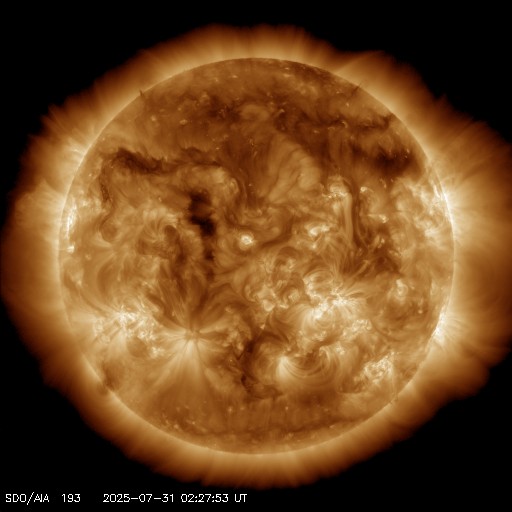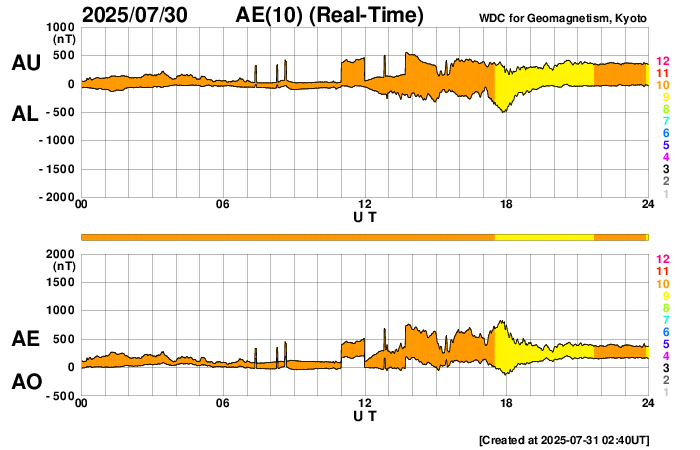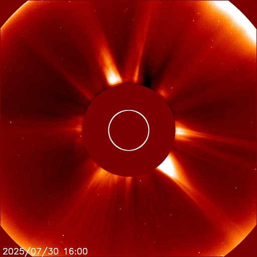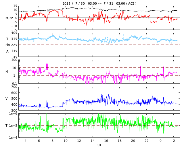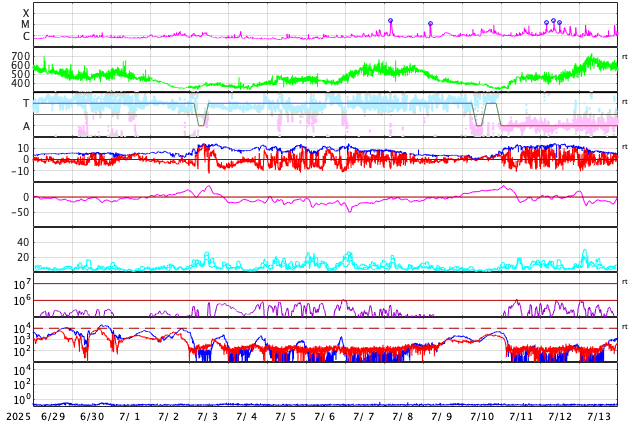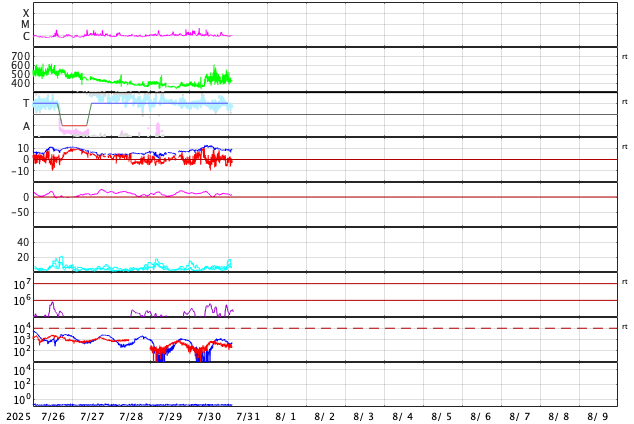 2025/ 7/31 11:49 更新 太陽風は平均的な速度に上がっています。太陽は穏やかです。 担当 篠原 370km/秒と低速だった太陽風の速度は、 昨夜、30日19時(世界時30日10時)頃に450km/秒へ高まりました。 速さとしては平均的な状態です。 現在は420km/秒程度で推移しています。 磁場強度は、7nTから12nTに上がり、その後8nTへ下がっています。 太陽の北半球に見えていた 小さいコロナホールの影響がやって来たのでしょうか。 この後は、太陽風は穏やかな状態に戻るのではないかと思います。 磁気圏では小規模の活動が起きている様で、 AR指数は、グラフの途中で変化がしばらく続いています。 太陽は、中心部南西側(右下)の4155黒点群で、 C4.7、C3.4の小規模フレアが発生しています。 その他は、C1〜2の小さいフレアで、太陽は穏やかな状態です。 SOHO衛星LASCO C2、C3で、 今日未明、31日3時(世界時30日18時)頃に、 CME(コロナ質量放出)が太陽の右下へ飛び出しています。 太陽の向こう側で発生した現象ではないかと思います。 フィラメント噴出の様に見えます。