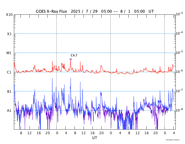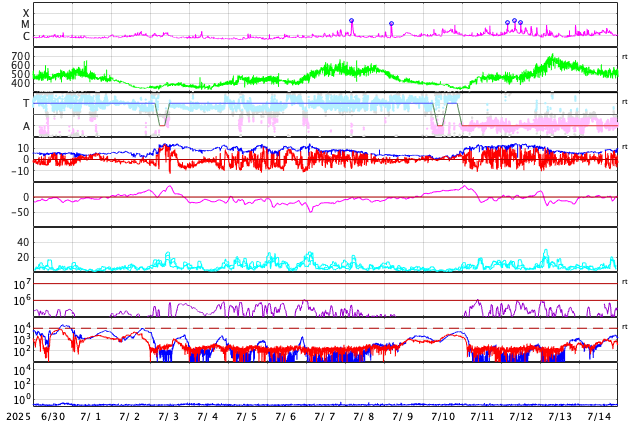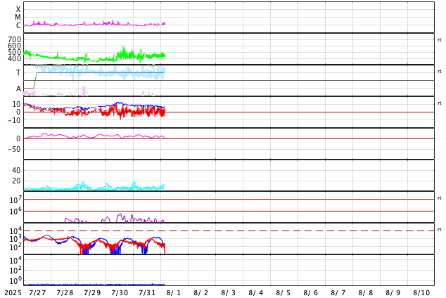 - 2025/ 7/28 12:03 太陽風は平均的な速度に戻っています。磁気圏は穏やかです。