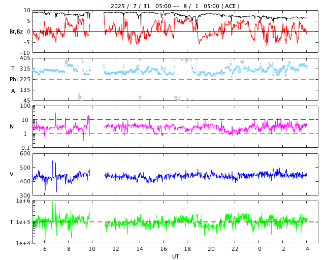 - 2025/ 7/31 11:49 太陽風は平均的な速度に上がっています。太陽は穏やかです。