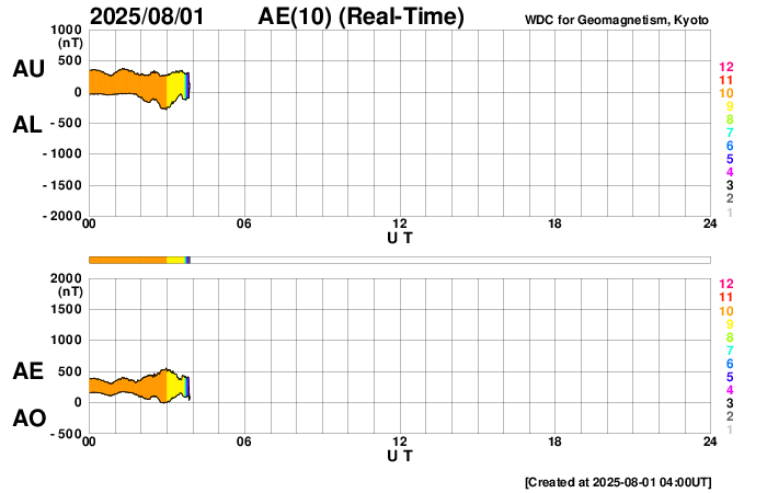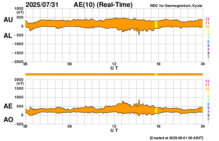 下段のAEグラフの値が高くなると、オーロラ活動が活発化しています。