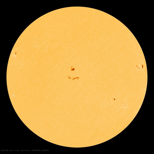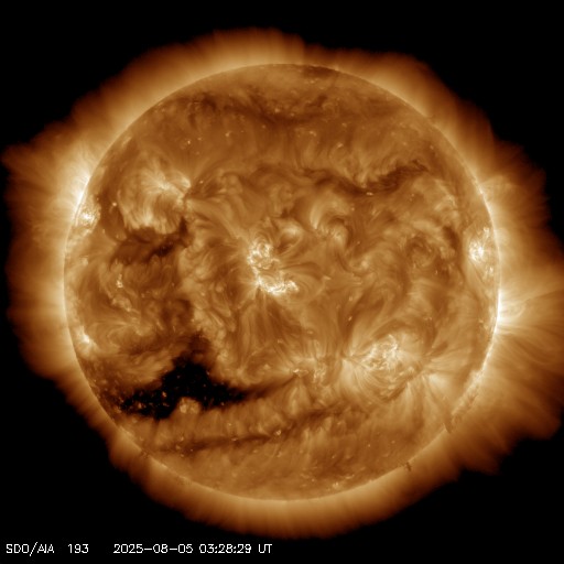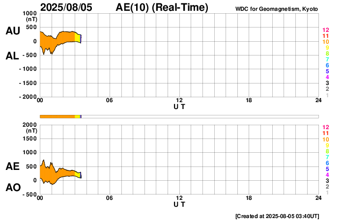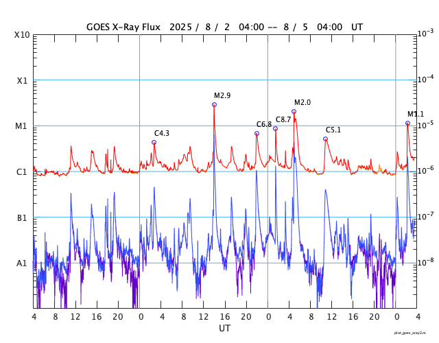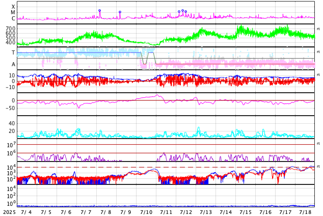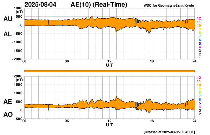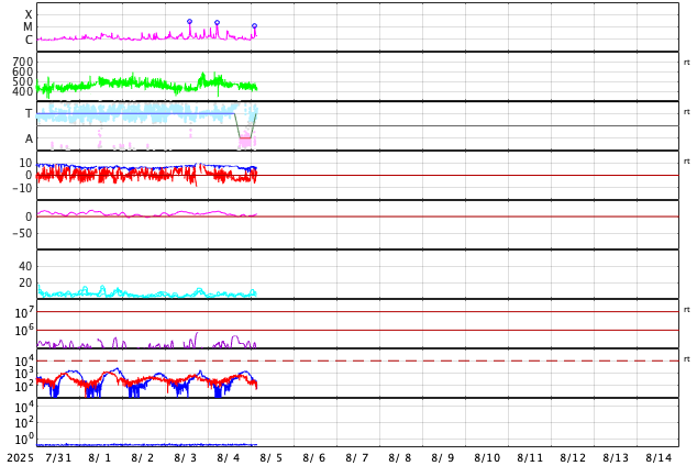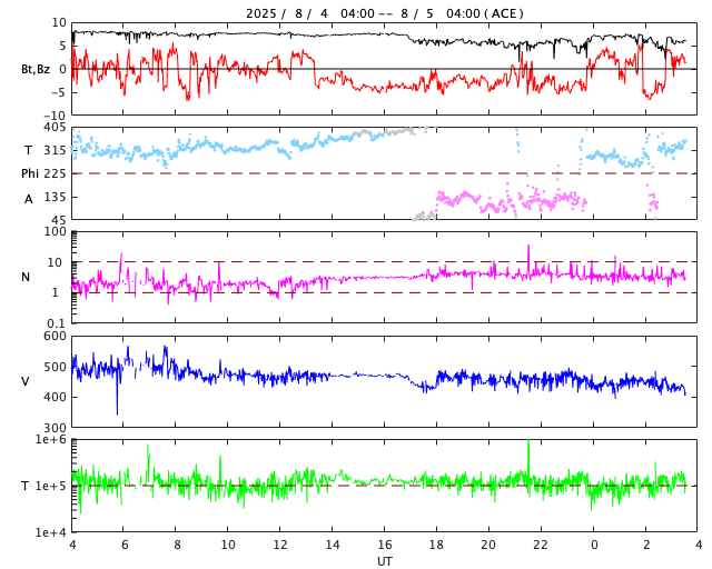 2025/ 8/ 5 12:45 更新 4168黒点群でMフレアが続いています。太陽風は平均的な状態です。 担当 篠原 太陽の中心部の4168黒点群で、 4日14時(世界時4日5時)頃にM2.0、M1.4、 5日11時(世界時5日2時)にM1.1と、 中規模フレアの発生が続いています。 この後も続くでしょうか。 引き続き注目してください。 その他の領域は穏やかです。 太陽風は、速度が500km/秒から430km/秒へ下がり、 平均的な速さに戻っています。 磁場強度も、8nTから6nTへ下がっています。 磁場の南北成分は、 グラフの途中から南寄りで変化しています。 磁気圏では小規模の活動が続く様になり、 AE指数は、500nT程度の変化が発生しています。 SDO衛星AIA193では、 南半球のコロナホールが太陽の中心線に近付いています。 4日後くらいから太陽風の速度が高まりそうです。