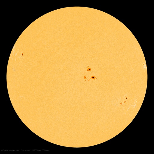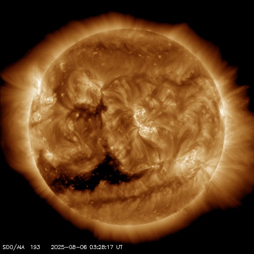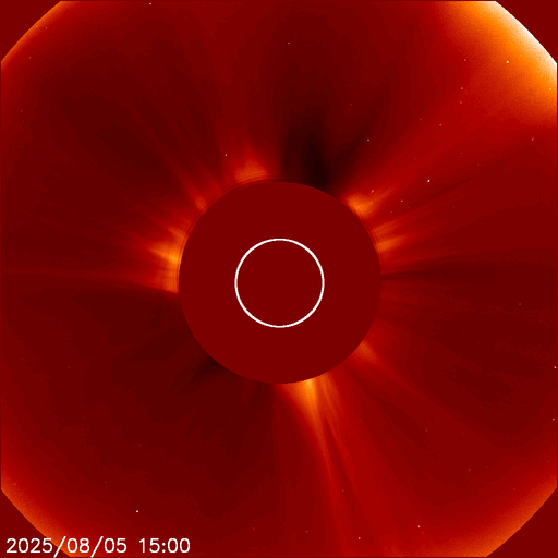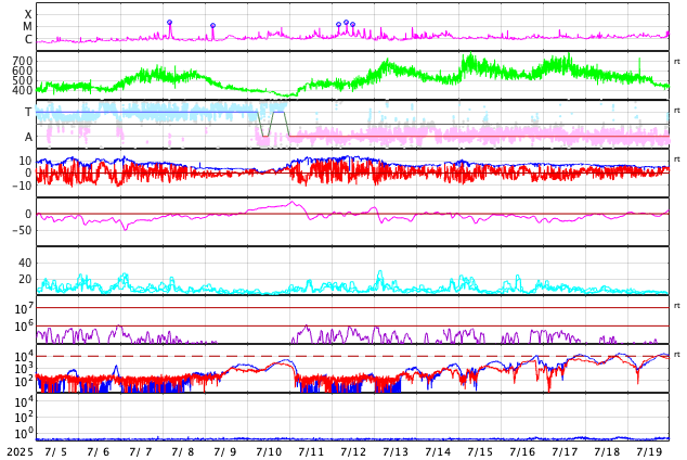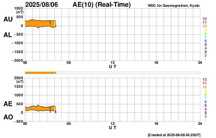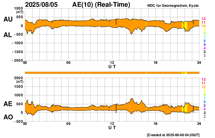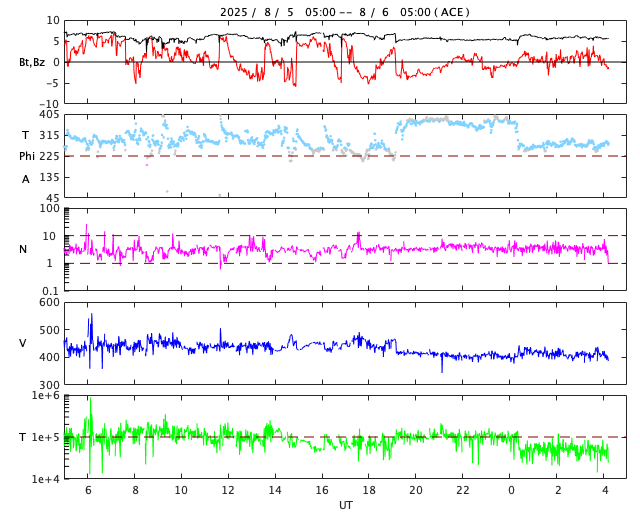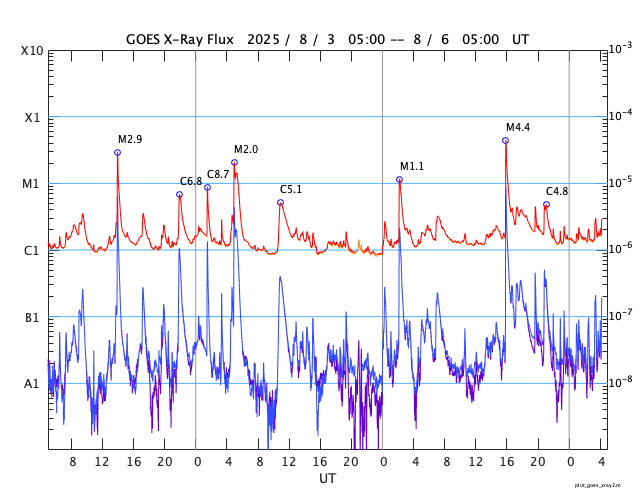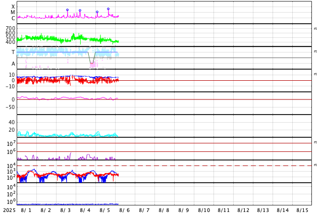 2025/ 8/ 6 13:23 更新 M4.4の中規模フレアが発生しました。太陽風は平均的な状態です。 担当 篠原 今日未明、6日1時(世界時5日16時)に、 太陽の中心部の4168黒点群で、 M4.4の中規模フレアが発生しました。 M4に達するフレアの発生は、 6月20日のM4.6以来で、1か月半ぶりです。 この時は、直前にX1.9の大規模フレアも発生しています。 SDO衛星AIA131と193の動画を掲載します。 131では、短い時間に激しい輝きが発生しています。 一方、193では、コロナのガスが急に動く様子が見えています。 SOHO衛星LASCO C2、C3を見ると、 太陽の右側に向かって淡いCME(コロナ質量放出)が飛び出しています。 このM4.4フレアに関係する噴出かもしれません。 その場合、発生地点が太陽の中心に近いので、 地球へも弱い影響がやって来るかもしれません。 4168群では、Mクラスのフレアが繰り返し発生していますが、 規模としては一番大きくなっています。 この後も活動は続くでしょうか。 引き続き注目してください。 太陽風は、速度が450km/秒から400km/秒に少し下がっています。 平均的な状態です。 磁場強度も5〜6nTと平均的な状態です。 磁気圏では、時々小規模の変化が発生していますが、 全体としては穏やかな状態です。 SDO衛星AIA193では、 南半球のコロナホールが太陽の中心線に達しています。 3日後くらいから、 この領域の影響で太陽風の速度が高まる可能性があります。