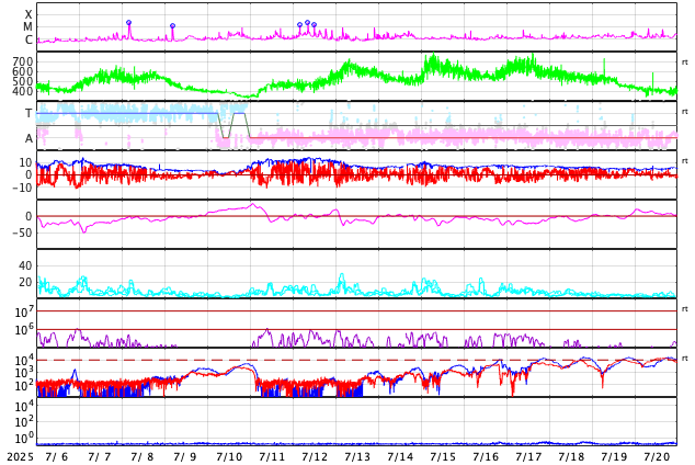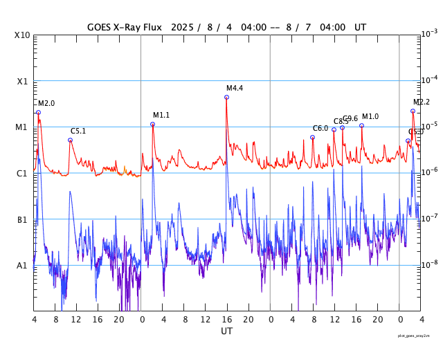 GOES衛星の太陽X線強度。赤・橙 = 0.1〜0.8 nm、青・紫 = 0.05〜0.4 nm (c) データ:NOAA/SWPC、作図:宇宙天気ニュース ![]() | |||||||||||||||||||||||||||||||||||||||||||||||||||||||||||||||||||||||||||||||||||||||||||||||||||||||||||||||||||||||||||||||||||||||||||||||||||||||||||||||||||||||||||||||||||||||||||||||||||||||||||||||||||||||||||||||||||||||||||||||||||||||||||||||||||||||||||||||||||||||||||||||||||||||