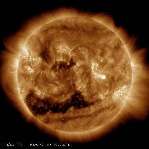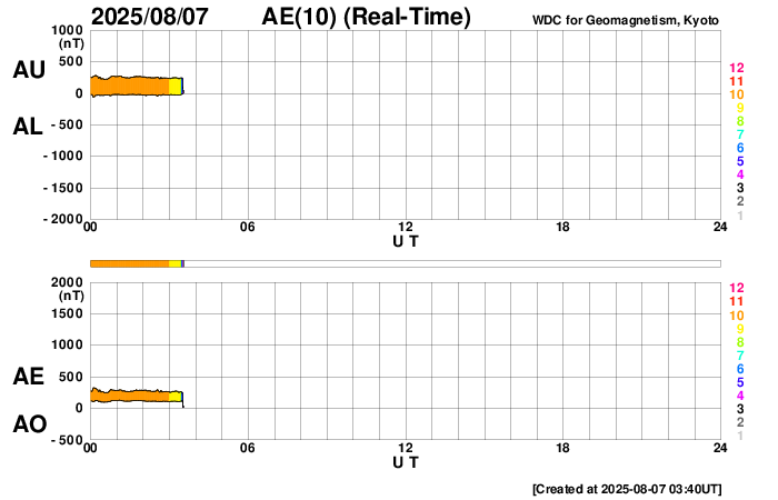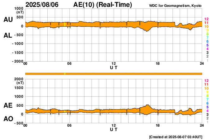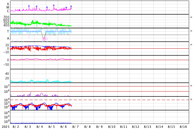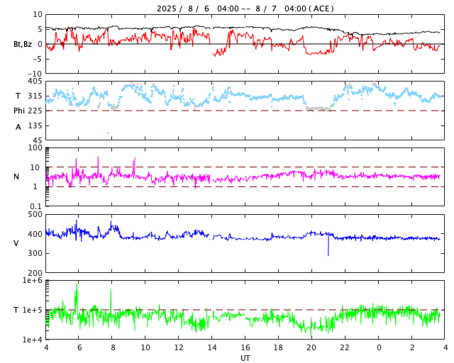 2025/ 8/ 7 12:52 更新 太陽風はやや低速になっています。太陽ではMフレアが続いています。 担当 篠原 太陽風の速度は、400km/秒から370km/秒へ少し下がり、 やや低速になっています。 磁場強度も5nTから4nTへ少し下がっています。 磁気圏は穏やかで、 AE指数は小規模の変化が少し起きている程度です。 SDO衛星AIA193では、 南半球の中心部から東側にかけて コロナホールが大きく広がっています。 明後日くらいから、 この領域の影響で高速の太陽風が到来しそうです。 太陽風の変化に注目して下さい。 太陽は、中心部西側(右側)の4168群で活動が続いていて、 C8.5、C9.6の小規模フレアが起きた後、 M1.0、M2.2と中規模フレアが2回発生しています。 黒点も昨日より大きくなっています。 引き続き注目してください。 また、北東(左上)の4172群で小さい活動が頻繁に起きていて、 C3.8、C3.7、C4.1などの小規模フレアが発生しています。 この後、活動の規模が大きくなるでしょうか。 ![]() SDO衛星のAIA193カメラによる太陽コロナの様子 (c) SDO (NASA) ![]() SDO衛星による太陽の可視光写真。マウスの矢印を写真に重ねると、黒点番号付きの写真に切り替わります。 (c) SDO (NASA) ![]() ACEが観測した太陽風の磁場(黒線は全体の強度、赤線は南北成分) 磁場の向き、プラズマの密度、速度、温度 (c) データ:NOAA/SWPC、作図:宇宙天気ニュース ![]() AE指数(速報値) 下段のAEグラフの値が高くなると、オーロラ活動が活発化しています。 (c) 京都大学WDC ![]() ![]() 27日の太陽周期に合わせた図 太陽が同じ面を地球に向けていた27日前の変化から、今後を予想することができます。 (c) 作図:宇宙天気ニュース