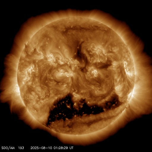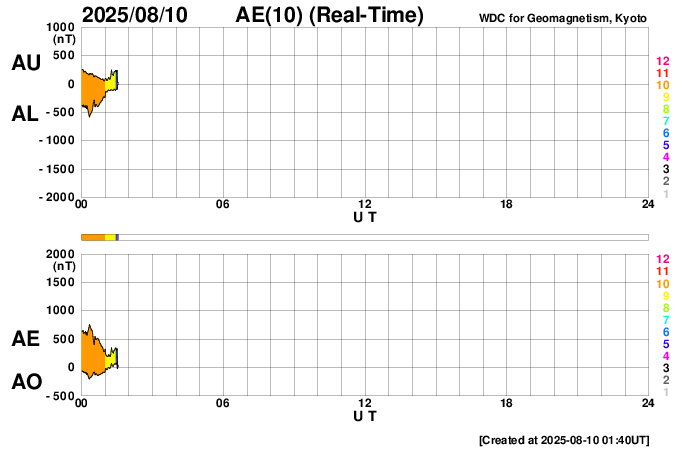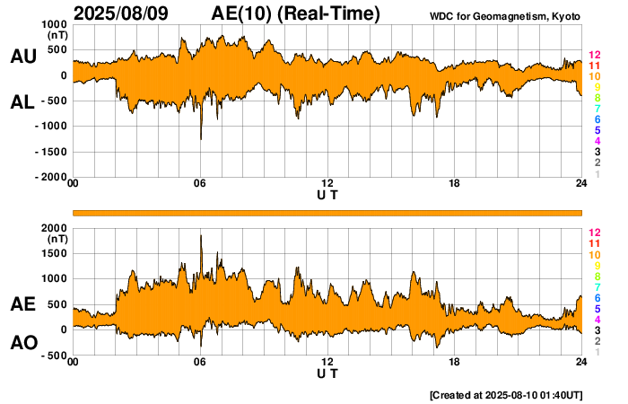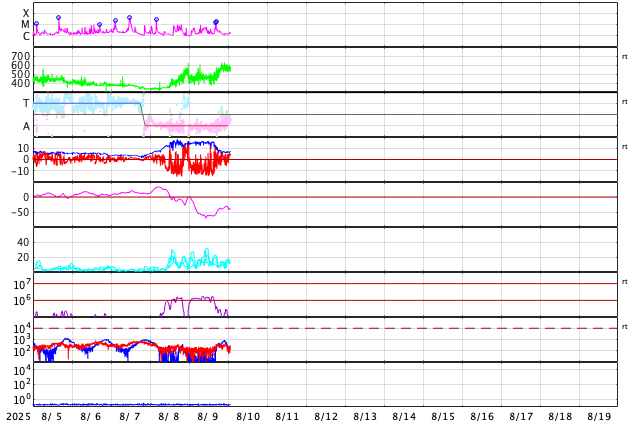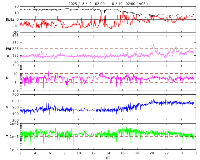 2025/ 8/10 10:58 更新 太陽風の速度は一旦下がり、再び570km/秒と高速になっています。 担当 篠原 550km/秒に高まった太陽風の速度は、 昨日のニュースの後に450km/秒へ下がりました。 今日に入る頃までこの状態が続き、 そこから再び高まって、 今朝以降は570km/秒と高速の状態に戻っています。 磁場強度は、15nTに強まった状態が続きましたが、 今日に入ると、速度と反対にこちらは低下して、 7nTと平均的な状態になっています。 不規則な変化になりましたが、 コロナホールの影響は続いている様です。 磁場の南北成分は、昨日のニュースの後に南向きに戻り、 -10nT前後の強い南向きが今日未明まで続きました。 磁気圏の活動も活発になって、 AE指数は1000nT程度の大きい変化が続いています。 その後は磁場は0nTを挟んで南北に変化する様になり、 磁場強度が下がったため、振れ幅も小さくなっています。 磁気圏の活動も小さくなって、 AE指数は小規模の変化が起きる程度です。 SDO衛星AIA193では、 太陽の南半球でコロナホールが大きく広がっています。 この後も6日くらい影響が続きそうです。 太陽は、西の端(右端)に近付いた 4168黒点群の活動が続いています。 C9.2、C6.1、M1.6、M1.7などの 小、中規模のフレアが発生しています。 その他の領域では目立った活動はなく、 4168群が太陽の向こう側に進むと、 太陽は穏やかになりそうです。