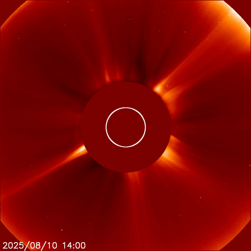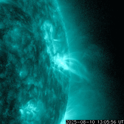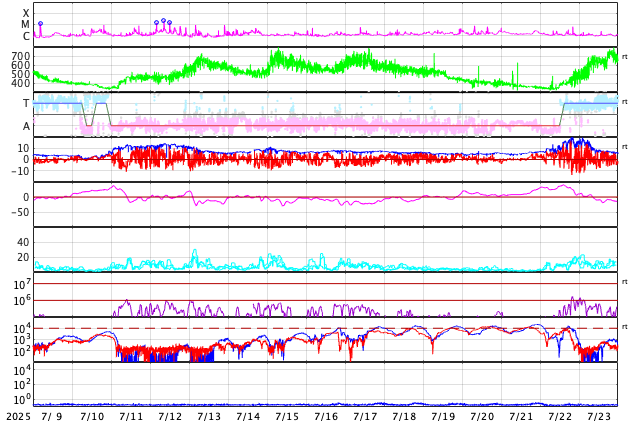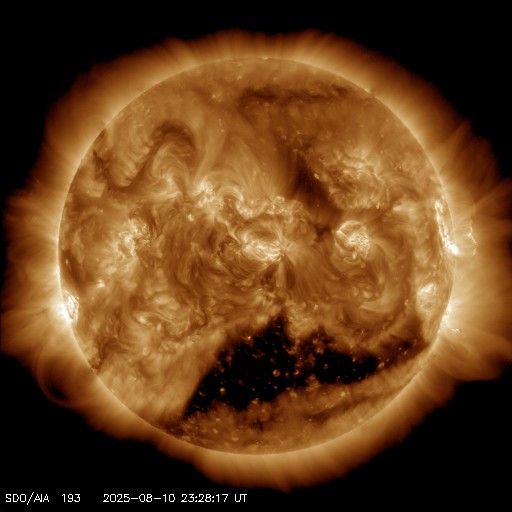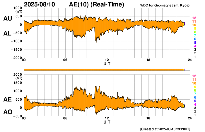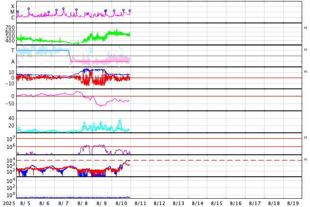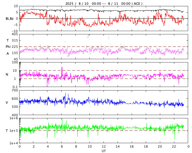 2025/ 8/11 08:39 更新 太陽風は高速の状態が続いています。Mフレアの発生が続いています。 担当 篠原 太陽風は、高速の状態が続いています。 速度は、570km/秒から530km/秒へ少し下がっています。 磁場強度は、7nTで安定しています。 磁場の南北成分は、南寄りで変化する様になっています。 速度の高まりもあり、磁気圏の活動は強まっていて、 AE指数は、500〜1000nT程度の中規模の変化が続いています。 SDO衛星AIA193では、 南半球のコロナホールの最後の広がりが 太陽の中心線付近に達しています。 高速の太陽風は、もう5日程度続きそうです。 太陽は、西の端(右端)に達した4168黒点群で、 昨日の昼、10日11時半(世界時10日2時半)にM1.7、 深夜、11日0時(世界時10日15時)にM2.2、 そして、今朝、11日8時(世界時10日23時)にM1.7と、 中規模フレアが3回発生しています。 SDO衛星AIA131によるM2.2フレアの動画を掲載します。 このフレアでは、CME(コロナ質量放出)も発生していて、 SOHO衛星LASCO C2、C3では、 太陽の右側へ飛び出す様子が観測されています。 横向きの噴出なので、地球への影響はありません。 4168群は、この後、太陽の向こう側へ進みます。 活発な状態が続いているので、 見えている間は注目して下さい。