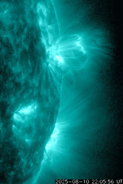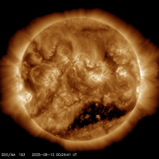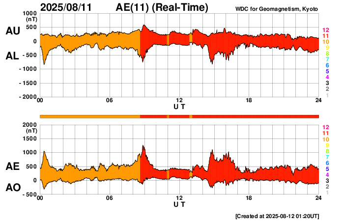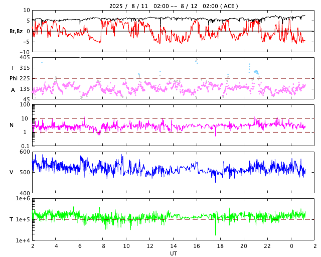 2025/ 8/12 10:29 更新 高速の太陽風が続いています。フレアが頻繁に発生しています。 担当 篠原 太陽風の速度は、520km/秒と高速の状態で安定しています。 磁場強度は、5〜6nTと平均的な状態です。 世界時8月8日に太陽風の速度が高まって、3日が過ぎたところです。 太陽風磁場の南北成分は、 南を向いたり、北を向いたりと変化しています。 南向きが強まった時間帯に磁気圏の活動が強まって、 AE指数では、1000nT程度の大きい変化が発生しています。 また、その他の時間帯でも小規模の活動が続いています。 SDO衛星AIA193の太陽コロナ写真では、 南半球のコロナホールは、 最後の部分が太陽の中心線を通り過ぎようとしています。 高速の太陽風は、あと4日くらいでしょうか。 太陽では、北西の端(右上)に達した4168黒点群と、 南西の端(右下)の向こう側に進んだ4173群の活動が目立っています。 SDO衛星AIA131による、この1日間の動画を掲載します。 4168群では、C9.9、C8.9、C7.2、M1.5、M1.6などの 小、中規模のフレアが続き、 4173群でも、M1.3、C7.5、C6.1などの 小、中規模のフレアが発生しています。 この後、4168群が太陽の向こう側に進んで完全に見えなくなると、 太陽は穏やかになりそうです。 ![]() 太陽の西の端の4168(上側)、4173(下側)黒点群の活動の様子。 (c) SDO衛星AIA131 (NASA)、(動画加工 : 宇宙天気ニュース) ![]() SDO衛星のAIA193カメラによる太陽コロナの様子 (c) SDO (NASA) ![]() SDO衛星による太陽の可視光写真。マウスの矢印を写真に重ねると、黒点番号付きの写真に切り替わります。 (c) SDO (NASA) ![]() ACEが観測した太陽風の磁場(黒線は全体の強度、赤線は南北成分) 磁場の向き、プラズマの密度、速度、温度 (c) データ:NOAA/SWPC、作図:宇宙天気ニュース ![]() AE指数(速報値) 下段のAEグラフの値が高くなると、オーロラ活動が活発化しています。 (c) 京都大学WDC ![]() ![]() 27日の太陽周期に合わせた図 太陽が同じ面を地球に向けていた27日前の変化から、今後を予想することができます。 (c) 作図:宇宙天気ニュース