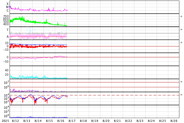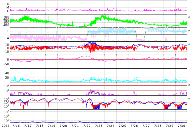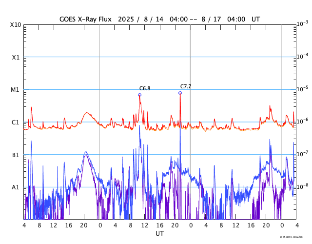 GOES衛星の太陽X線強度。赤・橙 = 0.1〜0.8 nm、青・紫 = 0.05〜0.4 nm (c) データ:NOAA/SWPC、作図:宇宙天気ニュース ![]() | |||||||||||||||||||||||||||||||||||||||||||||||||||||||||||||||||||||||||||||||||||||||||||||||||||||||||||||||||||||||||||||||||||||||||||||||||||||||||||||||||||||||||||||||||||||||||||||||||||||||||||||||||||||||||||||||||||||||||||||||||||||||||||||